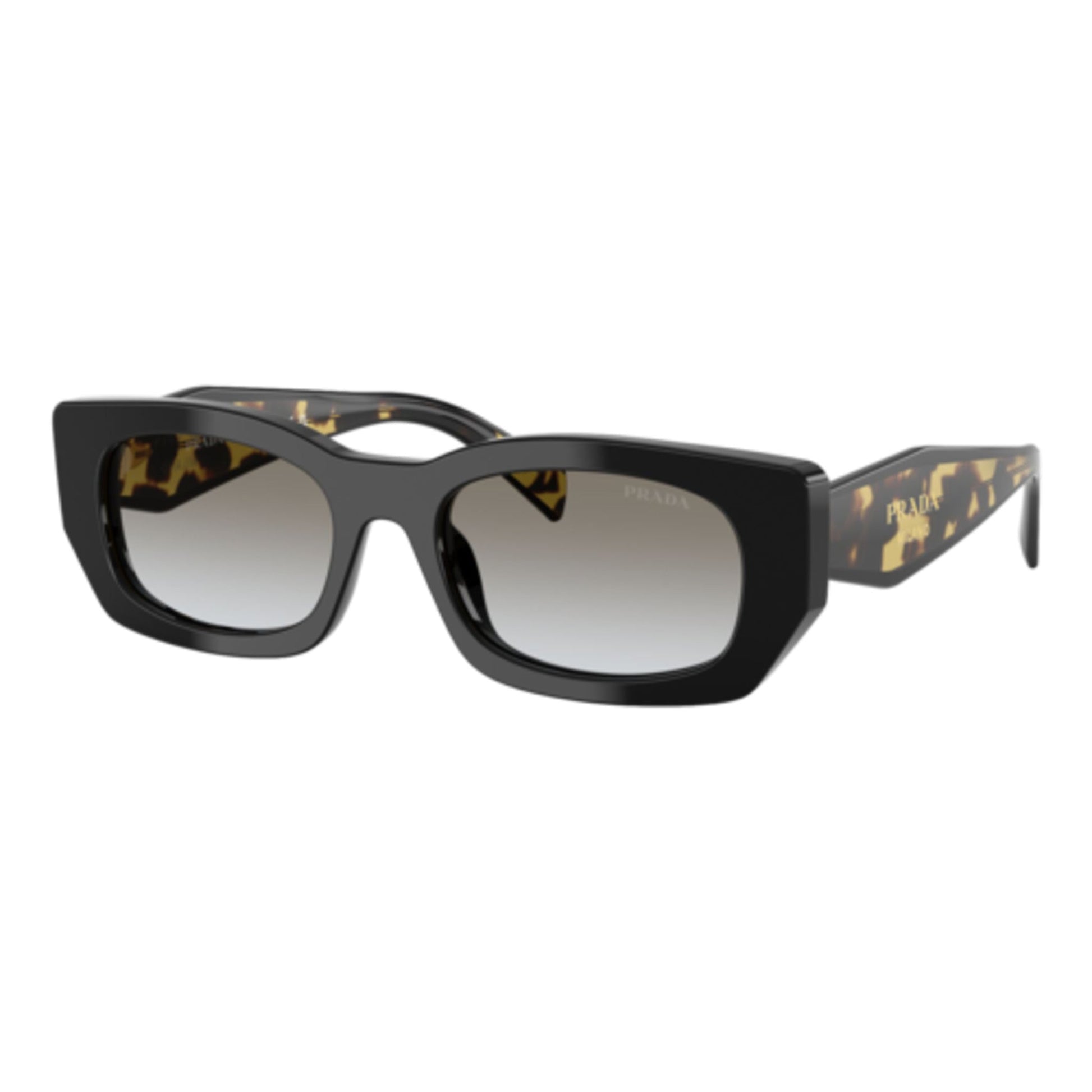 Sunglasses characterized by a distinctive rectangular silhouette and bold, chunky lines. Refined acetate layers glued to the side trim create contemporary, elegant allure. Prada lettering logo. Eye size: 53; Frame: Black; Lens: Grey Gradient; Lens Material: Standard Plastic