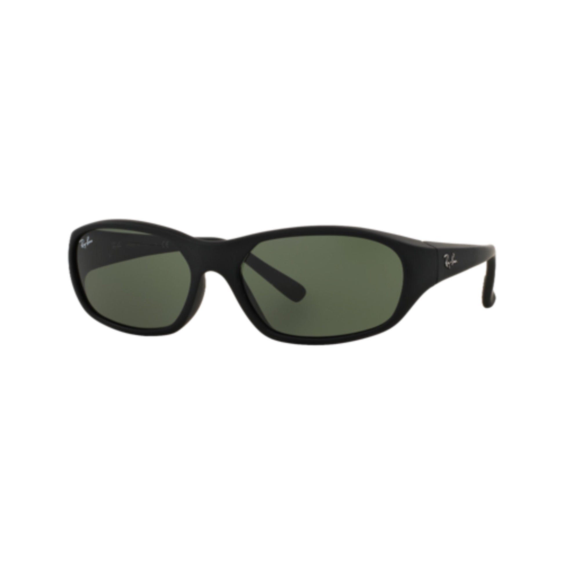 With a sporty, contoured silhouette, these sunglasses are stylishly cool. Rounded rectangular lenses provide excellent color contrast and clarity while blocking the sun's harshest rays. The classic metal Ray-Ban signature is prominent on curved temples. Eye size: 59; Frame: Matte Black; Lens: Green Classic G-15; Lens Material: Standard Plastic