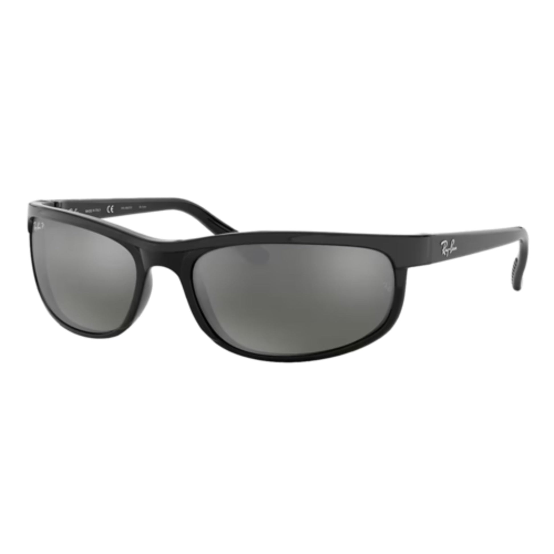 Ray-Ban RB2027 Predator 2 sunglasses take on the traditional Rectangle Sunglasses design with a Ray-Ban signature logo displayed on the thin temples. The inside of the Predator temple tips feature a subtle, striped texture treatment. Their wrapped fit creates a sporty look that is both casual and athletic. Eye size: 62; Frame: Matte Black/Black; Lens: Polarized Grey Mirror; Lens Material: Crystal Polarized Glass