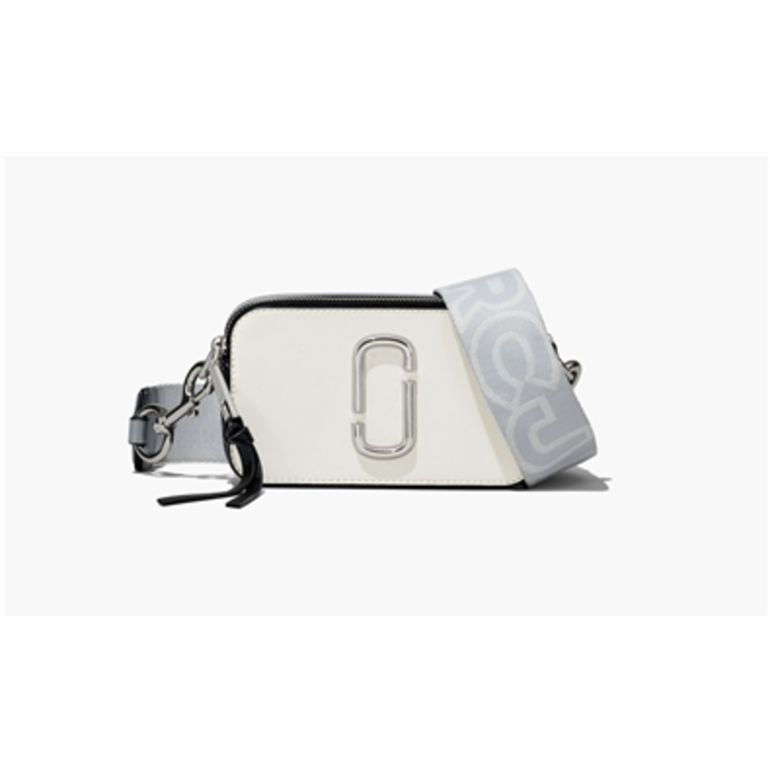 Small camera-style bag in Saffiano leather with an adjustable crossbody strap. Double-J hardware. Two zip sections. Interior and exterior slip pockets. Removable and adjustable webbing strap. Dimensions: 7" L x 2" W x 4" H. Strap Drop Length 27 in.