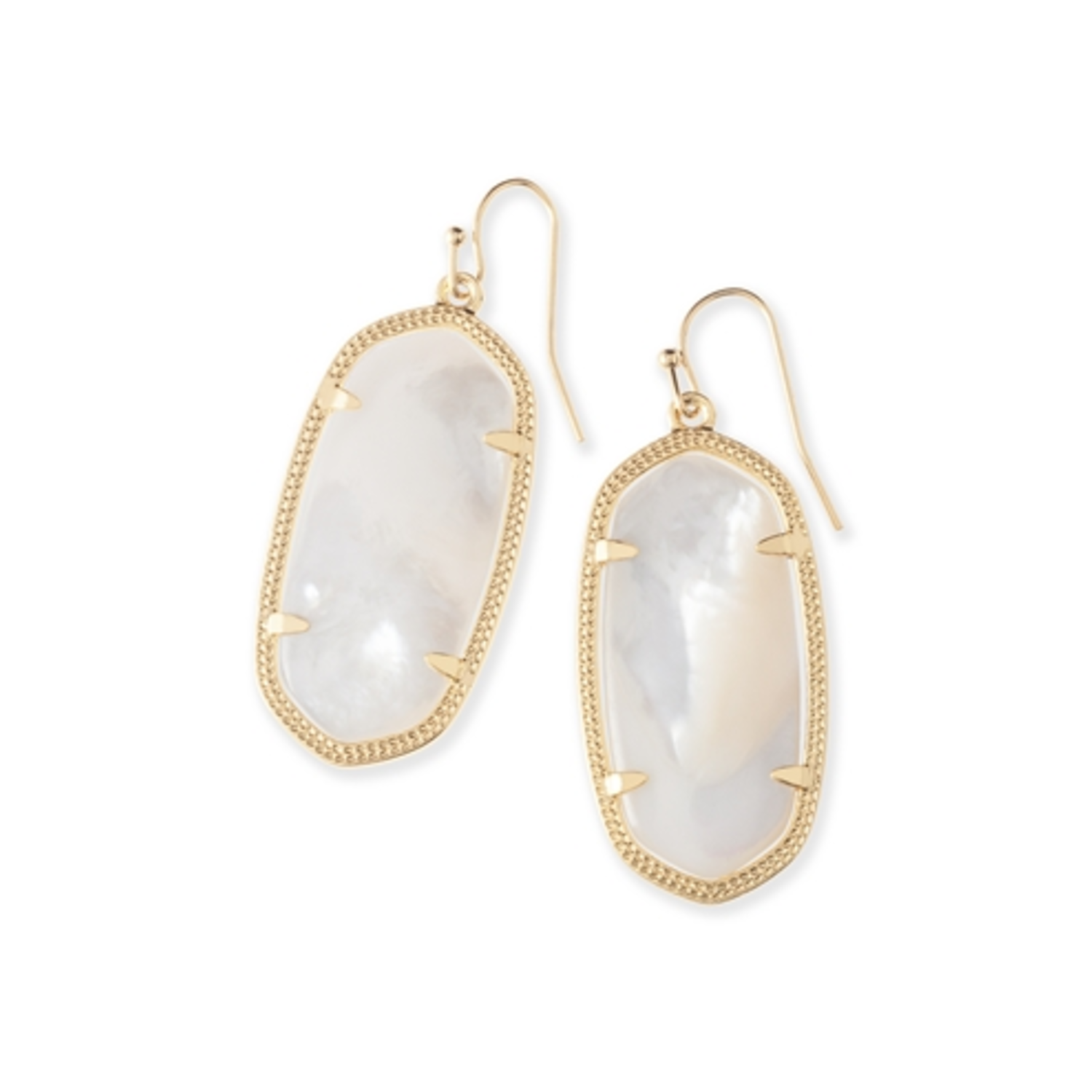 The strong, scratch-resistant, and beautifully iridescent pair of Elle Gold Earrings in Ivory Mother-of-Pearl is a classic sure to spark conversation. Loved for their versatility, these drop earrings pair perfectly with whatever you wear. Metal: 14K Gold Plated Over Brass Size: 1.75"L x 0.75"W on ear wire, Material: Ivory Mother-of-Pearl.