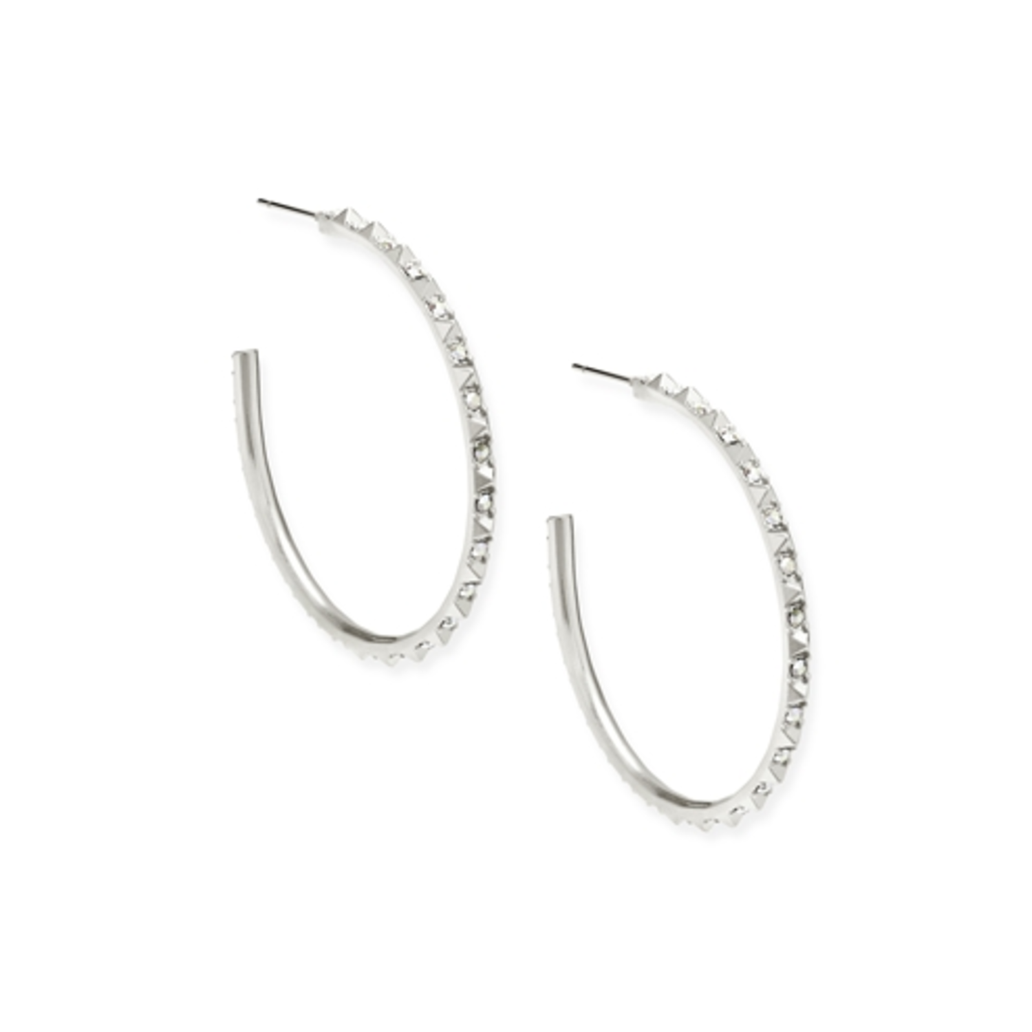 A classic silhouette and subtle sparkle combine to create the Veronica Hoop Earrings in Silver. A wardrobe staple, these weightless hoop earrings effortlessly dress up the everyday. With the Veronica Hoop Earrings in your jewelry box, you'll always have the perfect accessory for any outfit. Rhodium Plated Over Brass Size: 1.7" outer diameter Material: Iridescent crystal.