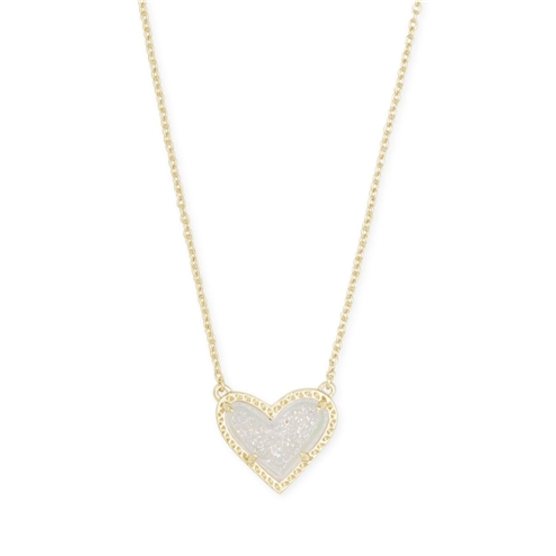 This dazzling and feminine classic, Ari Heart Gold Pendant Necklace in Iridescent Drusy is our new obsession. With an asymmetrical heart accent in one of our favorite stones, this Gold pendant necklace is made to be a one-of-a-kind everyday accent piece.14K Gold Plated Over Brass, Material: Iridescent Drusy, Lobster Clasp. 0.49" L x 0.57" W Pendant On 15"L Chain + 2" Extender.
