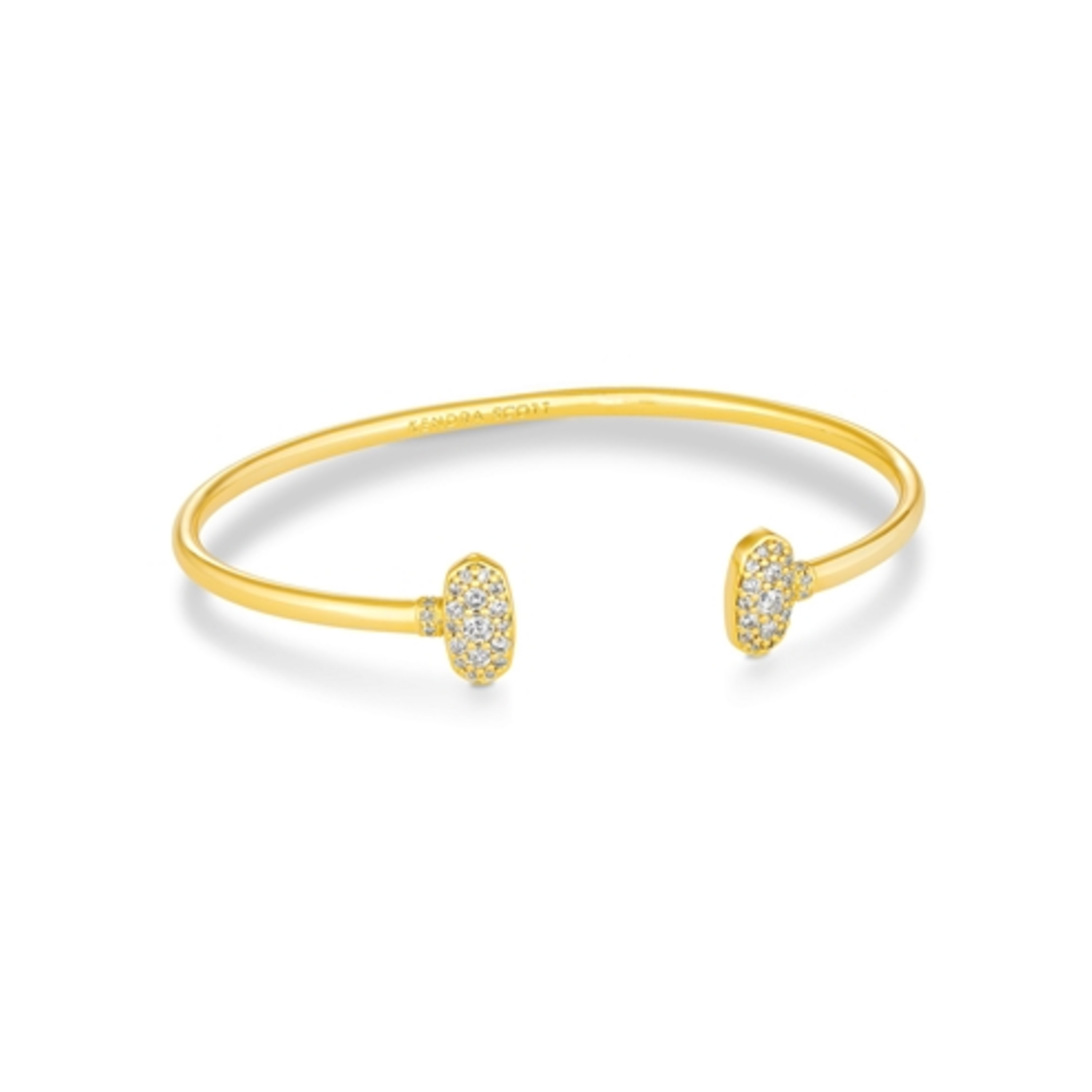 A minimalist cuff, framed by our signature icon. The Grayson Gold Cuff Bracelet in White Crystal is a simple piece with maximum sparkle, perfect for stacking or dressing up solo. 2.28" inner diameter, 0.41" L x 0.22" W stations