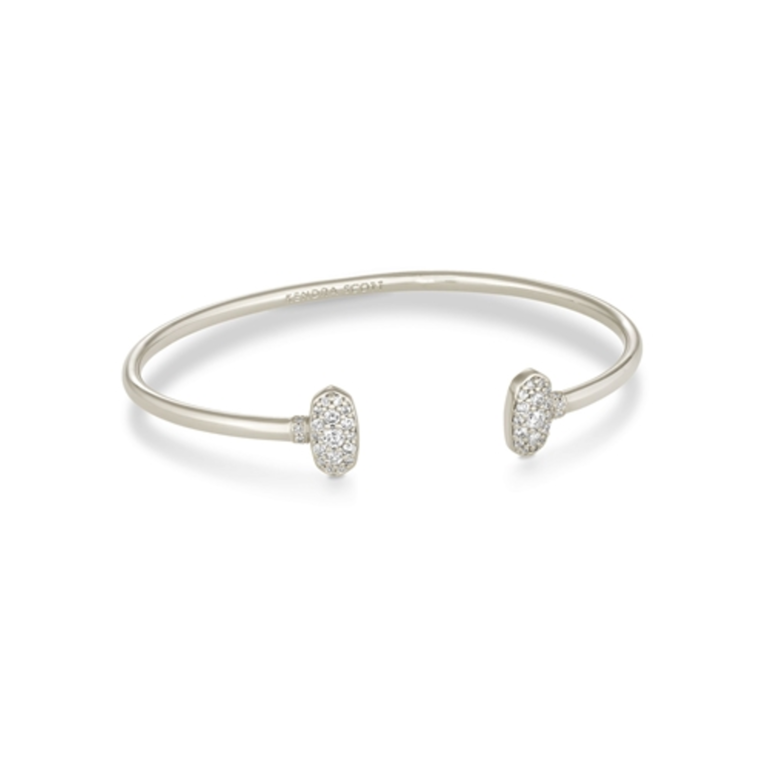 A minimalist cuff, framed by our signature icon. The Grayson Silver Cuff Bracelet in White Crystal is a simple piece with maximum sparkle, perfect for stacking or dressing up solo. 2.28" inner diameter, .41"L x .22"W stations
