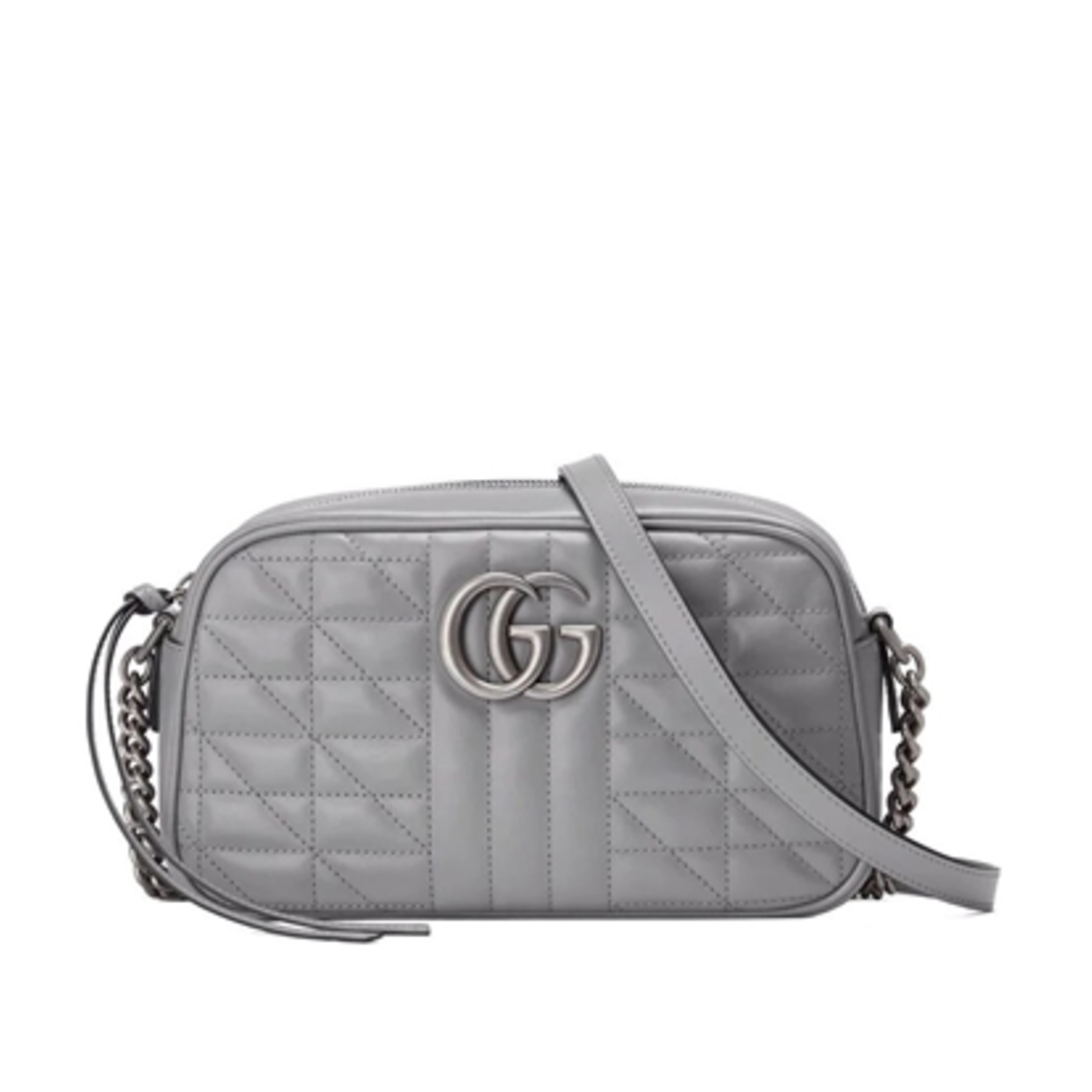 The small GG Marmont shoulder bag is a piece that encompasses Gucci's craftsmanship and ability to modernize classic styles. This smooth leather comes in sleek, classic dark grey- elevating any outfit with a touch of luxury. The matelassé stitching is in a modern geometric pattern to add texture and interest to this staple. A timeless piece, this bag is the perfect size for your essentials without weighing you down. Antique silver toned hardware that prominently displays the iconic GG emblem is front and center as well as an adjustable chain shoulder strap. Where you go, fashion follows. Features: Interior open pocket with a zip top closure. Microfiber lining with a suede-like finish.