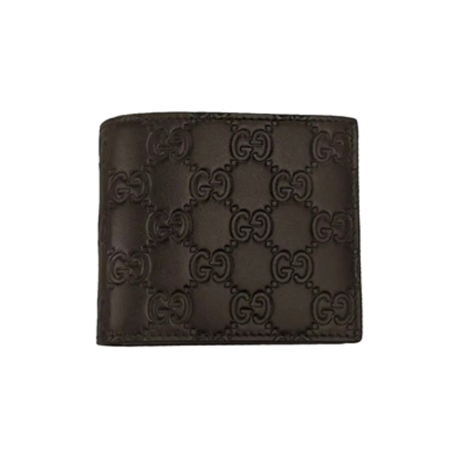 Crafted in Italy from premium embossed leather, the Gucci Men's Signature GG Leather Bifold Wallet in dark brown offers a blend of iconic style and everyday utility. Showcasing the signature GG pattern, this slim bifold design opens to reveal eight card slots, two bill compartments, and two slip pockets for added organization. The wallet is lined with smooth leather and durable fabric for long-lasting structure. Perfectly sized for pocket use, it measures approximately 4.3" W × 3.5" H × 0.5" D when folded and weighs approximately 0.3 lbs. A refined choice for those who appreciate understated luxury.