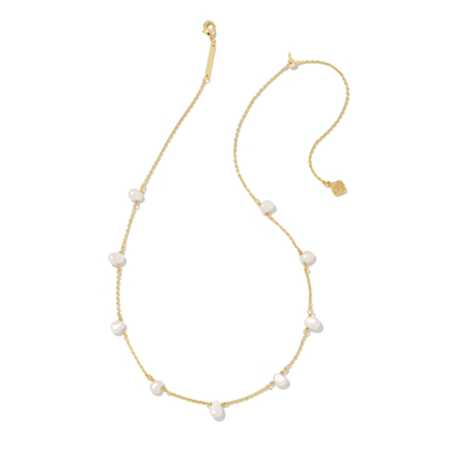 The classic pearl strand gets a modern refresh with the Leighton Gold Pearl Strand Necklace in White Pearl. Nine cultured freshwater pearls shimmer along a dainty gold chain—its the ideal base for an everyday stack or a classy standalone piece. Size: 16" chain w/ 3" extender.