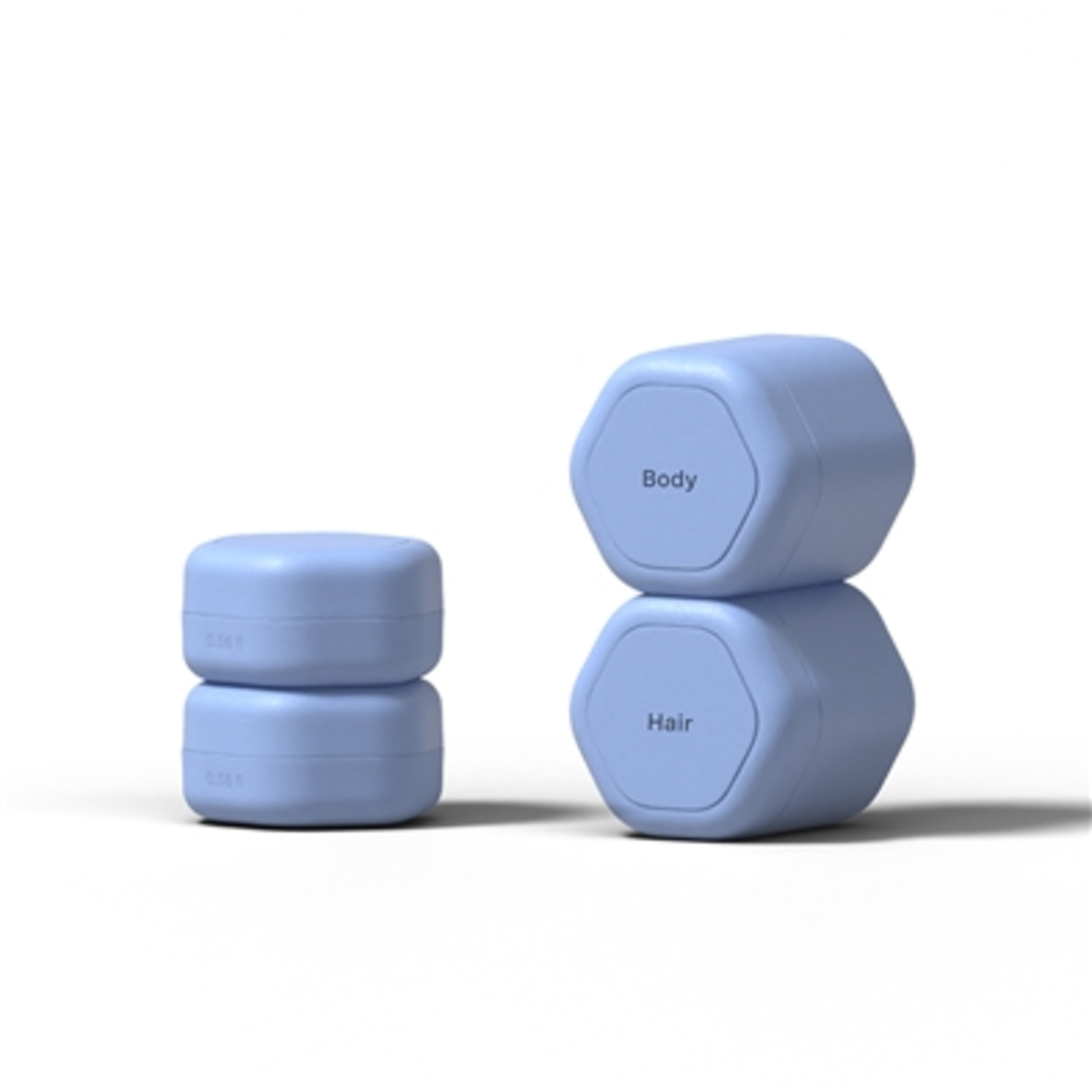 The Essentials includes two Medium (1.32 floz) capsules labeled "Body" and "Hair" and two Small (.56 floz) capsules labeled"Face" and blank. The perfect set for your essential travel products, so you can bring your favorite products with you on the go.Each container made incorporating post-consumer material is leakproof, magnetic, space-saving, TSA-approved and comes with a magnetic interchangeable label.