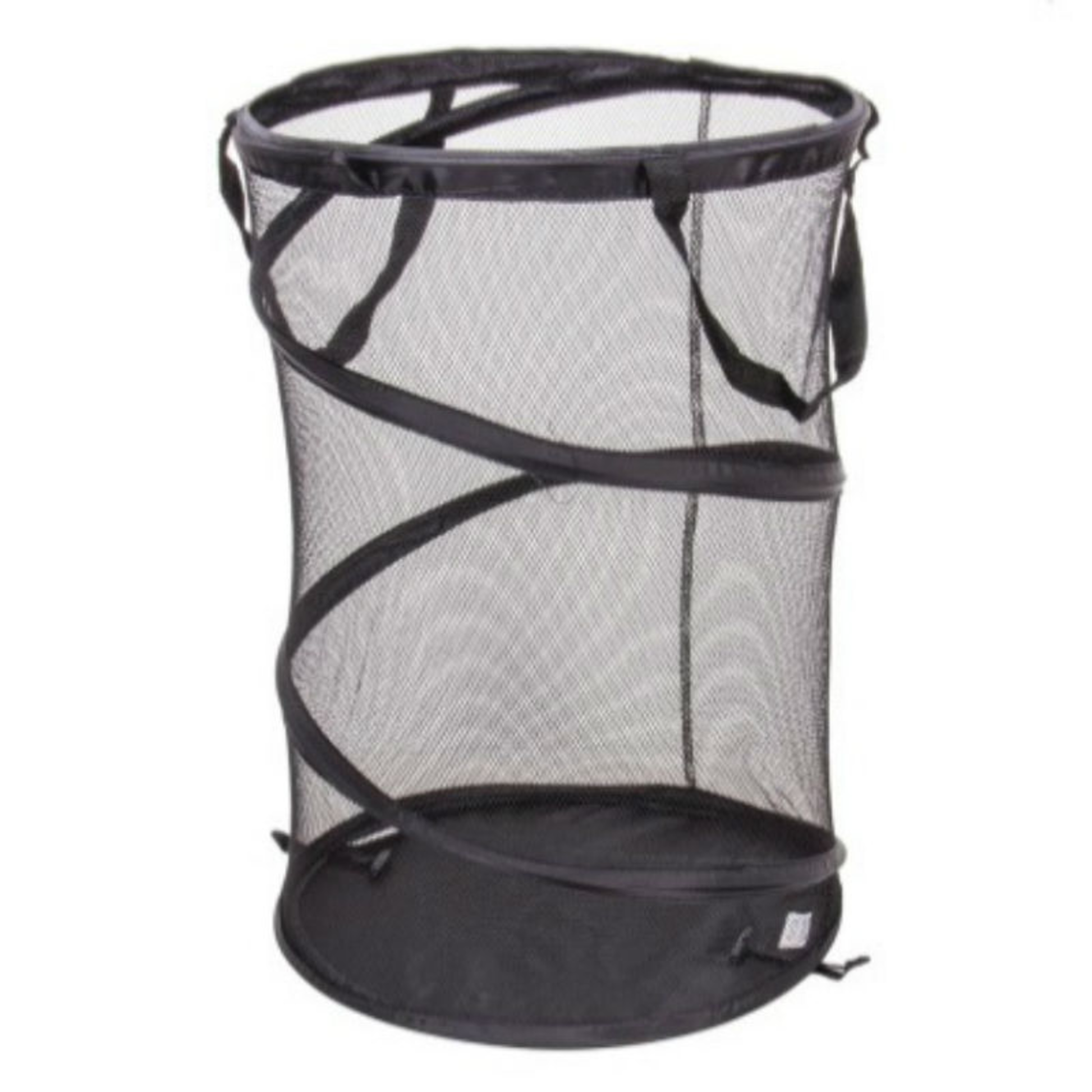 Household Essentials Pop-Up Laundry Hamper keeps laundry under wraps. This soft-sided hamper has a mesh belly band, so you can tell just how much laundry there is to do. Its strong and flexible steel frame lets this hamper fold flat for storage and spring back to its original shape quickly and easily. The breathable black mesh holds clothes safely while helping them air, thus minimizing odor. With two sturdy handles making transport easy, laundry may not seem like such a chore anymore. Maybe. This hamper measures 25 inches high, 16 inches wide, and 16 inches deep.