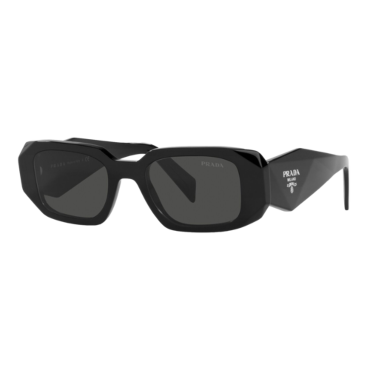 Acetate sunglasses with an oversized, geometric design. The bold frame front has an avant-garde silhouette defined by the extreme angled cut of the outer corners. The three-dimensional design of the temples is decorated with an iconographic interpretation of the traditional Prada triangle logo. Eye size: 49; Frame: Black; Lens: Dark Grey; Lens Material: Standard Plastic
