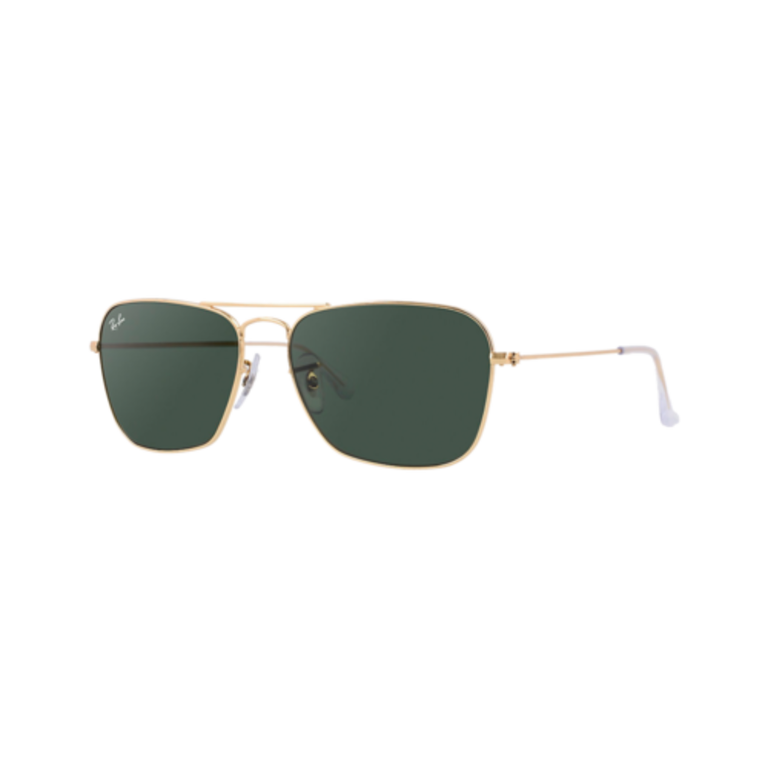 Originally launched in 1957, Ray-Ban Caravan sunglasses are a streamlined, geometric model and an alternative to the classic Aviator Sunglasses. The Ray-Ban signature logo is displayed on the nose pads and lenses. The Caravan features Square sunglass lenses and frames, as opposed to the teardrop lens shape sunglasses seen in the Aviator. Eye size: 58; Frame: Gold; Lens: Green Classic G15; Lens Material: Crystal Glass