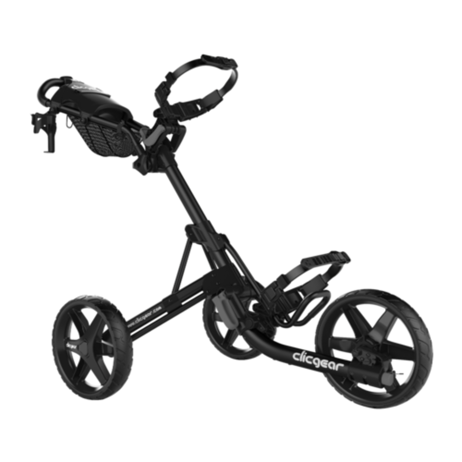 Clicgear's flagship 3-wheel cart. Refined and upgraded through the years. The Model 4 features new silicone bag strap system, new adjustable upper saddle, new lower saddle, front-wheel engaged hand brake, independent handle bar adjustments, large console (scorecard, ball, pencil & tee holders), large storage net, accessory mounts x4 (standard cup holder included), umbrella mount & bracket, and 21lb heavy-duty frame. It quickly folds down to a compact 13" x 15" x 24" and it accommodates most stand bags.