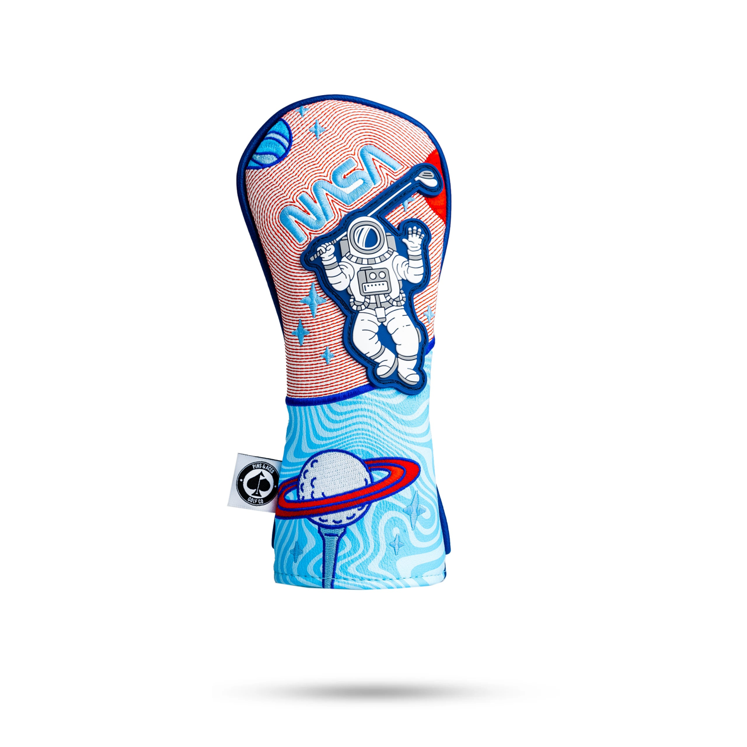 Pins & Aces x NASA 2.0 is here with a hybrid head cover with a captivating custom design. Handmade and hand-sewn, this head cover features unparalleled quality, utilizing a distinctive synthetic leather that reduces fading, cracking, ripping, or discoloration. The bold, innovative PVC patch features a space-walking astronaut wielding a golf club makes this head cover a true conversation starter on the golf course.