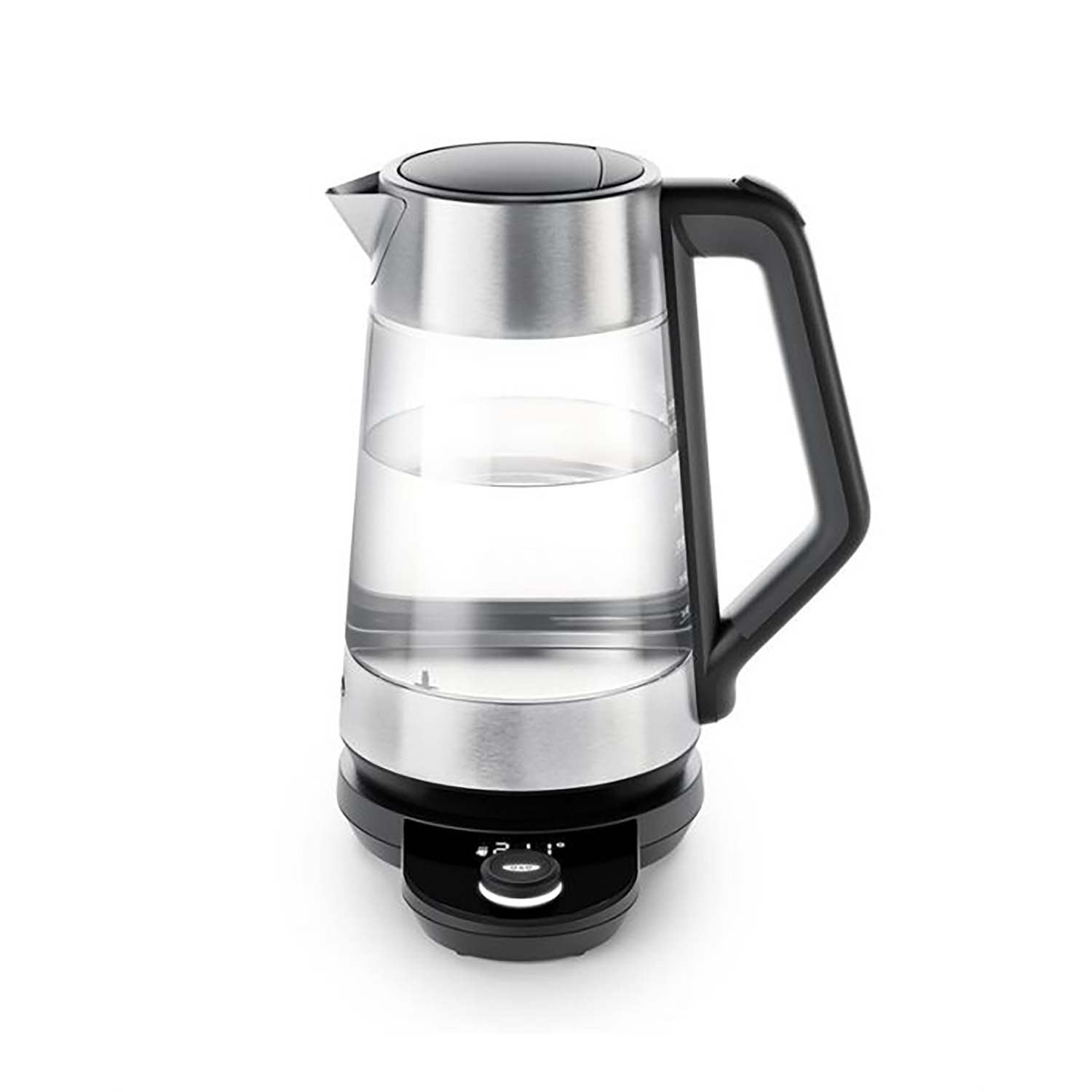 Perfect tea time anytime. Select a precise temperature for your water with a simple twist of a knob. Choose any temperature between (170-212F). Water temperature is held for up to 30 minutes. Kettle is cordless when removed from the base. Silicone base prevents kettle from damaging surfaces. BPA-free. Made of Borosilicate class silicone and stainless steel. Dimensions: 10.4" x 7.8" x 13.4"