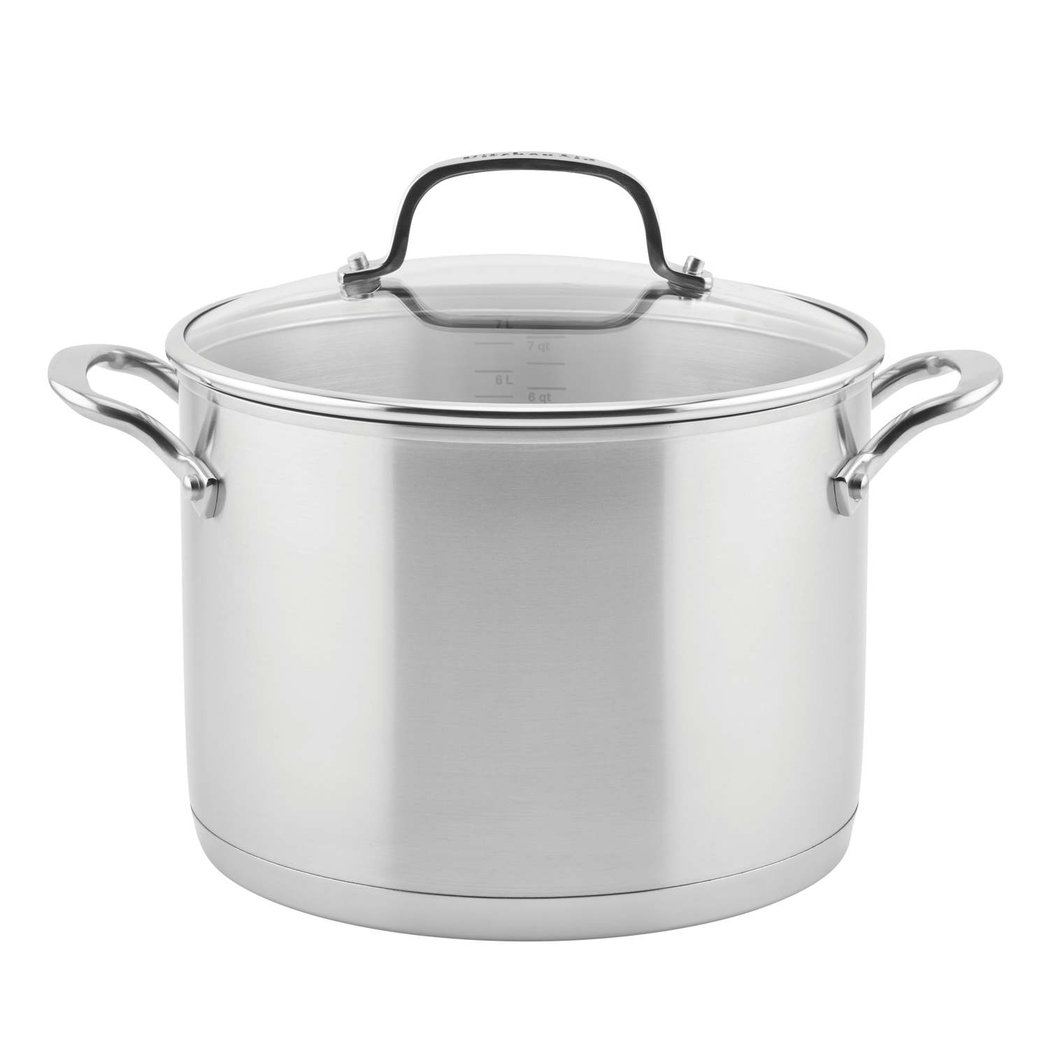 Create delicious soups for the whole family with this 8-quart stockpot. Heavy-gauge stainless steel with triple-layer bases. Construction supports even heating and eliminates hot spots. Tempered glass lids lock in heat and flavor. Double-riveted stainless steel handles. Oven safe to 500F (260C). Compatible with all stovetops including induction. Dishwasher safe.