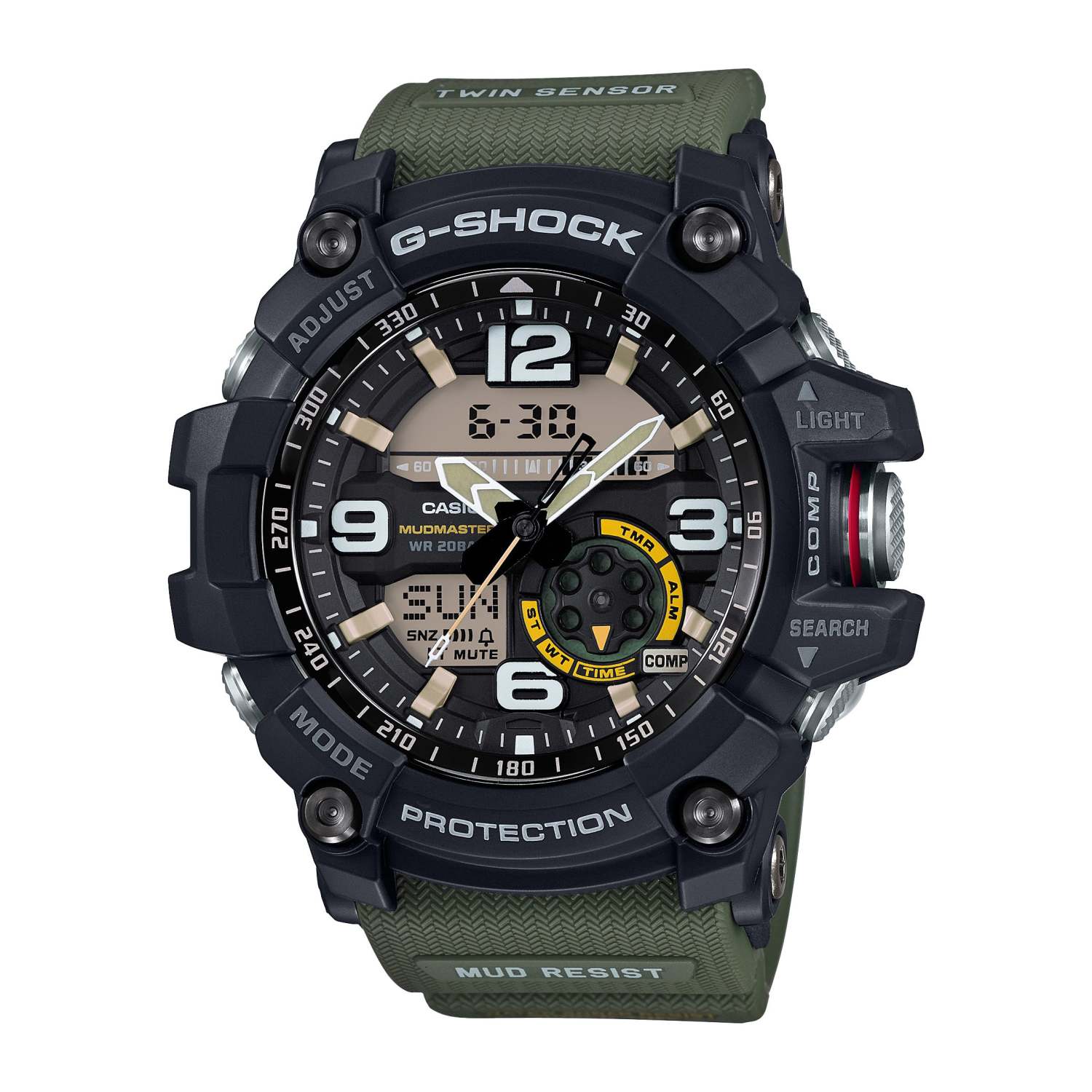 Twin Sensor capabilities provide compass and thermometer. Multiple gaskets on the pipes guide buttons and shafts to keep mud out. Super Illuminator. World time - 31 time zones. 1/100 Second stopwatch. Countdown timer. 5 Daily alarms with 1 snooze alarm. Full auto calendar. Hourly time signal. Analog display with 3 hands. Digital display shows time and date. Green band resembles a cloth band texture. Black resin case and stainless steel bezel. Mud and Shock resistant. Water resistant to 200 M. Case size: 56.2mm x 55.3mm x 17.3mm.
