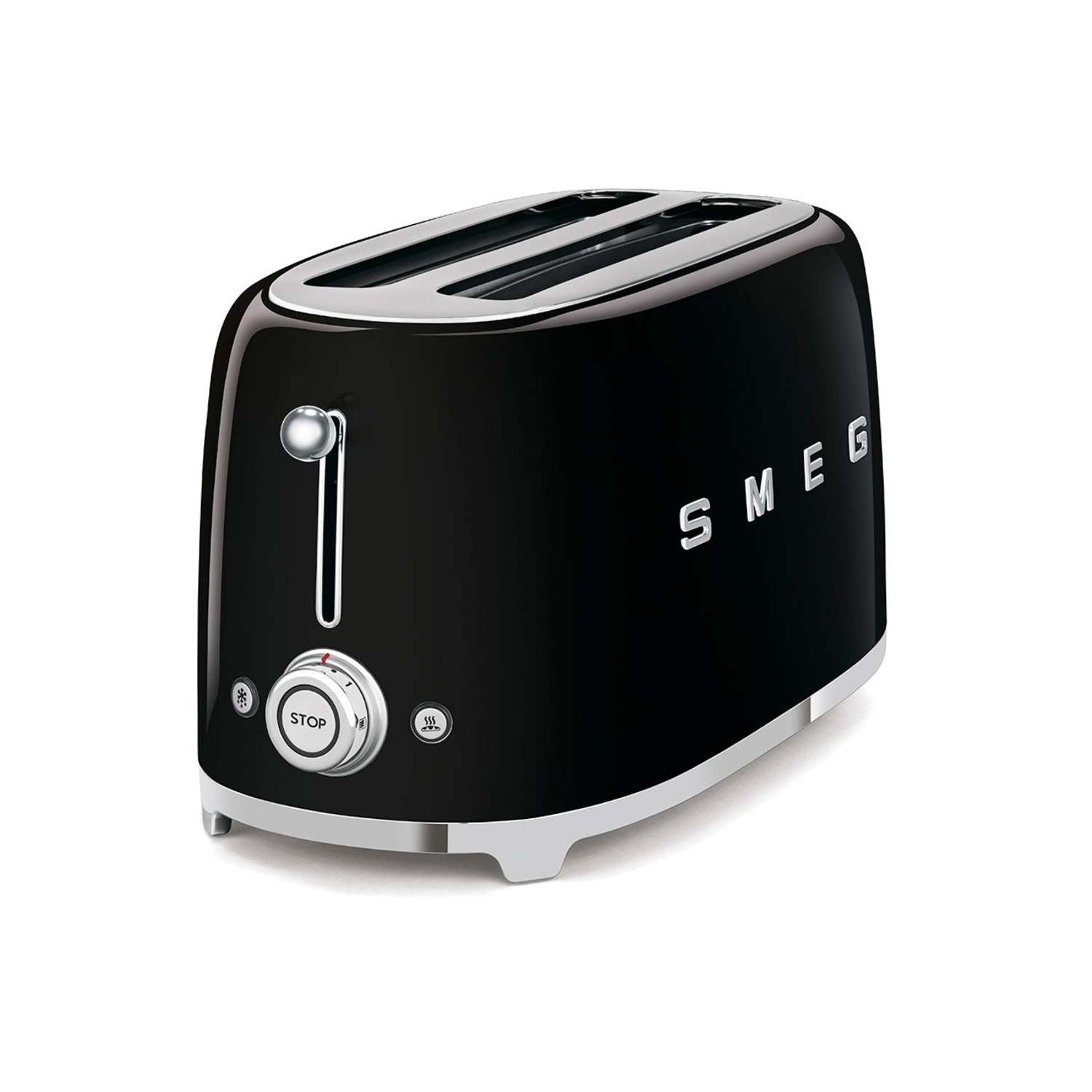 Smeg kitchen appliances offer retro Italian style carried from its founding in 1948. Multi-function control offers versatile toasting options. Features two long slots that fit up to 4 slices. Reheat heats toast and bread or continue toasting. Defrost unfreezes frozen slices. Bagel function browns one side of bread without toasting the other. Self-centering racks supports even toasting no matter the size. Offers 6 toasting levels. Backlit buttons and control knobs. Crumb tray. Anti-slip feet. Integrated cord.