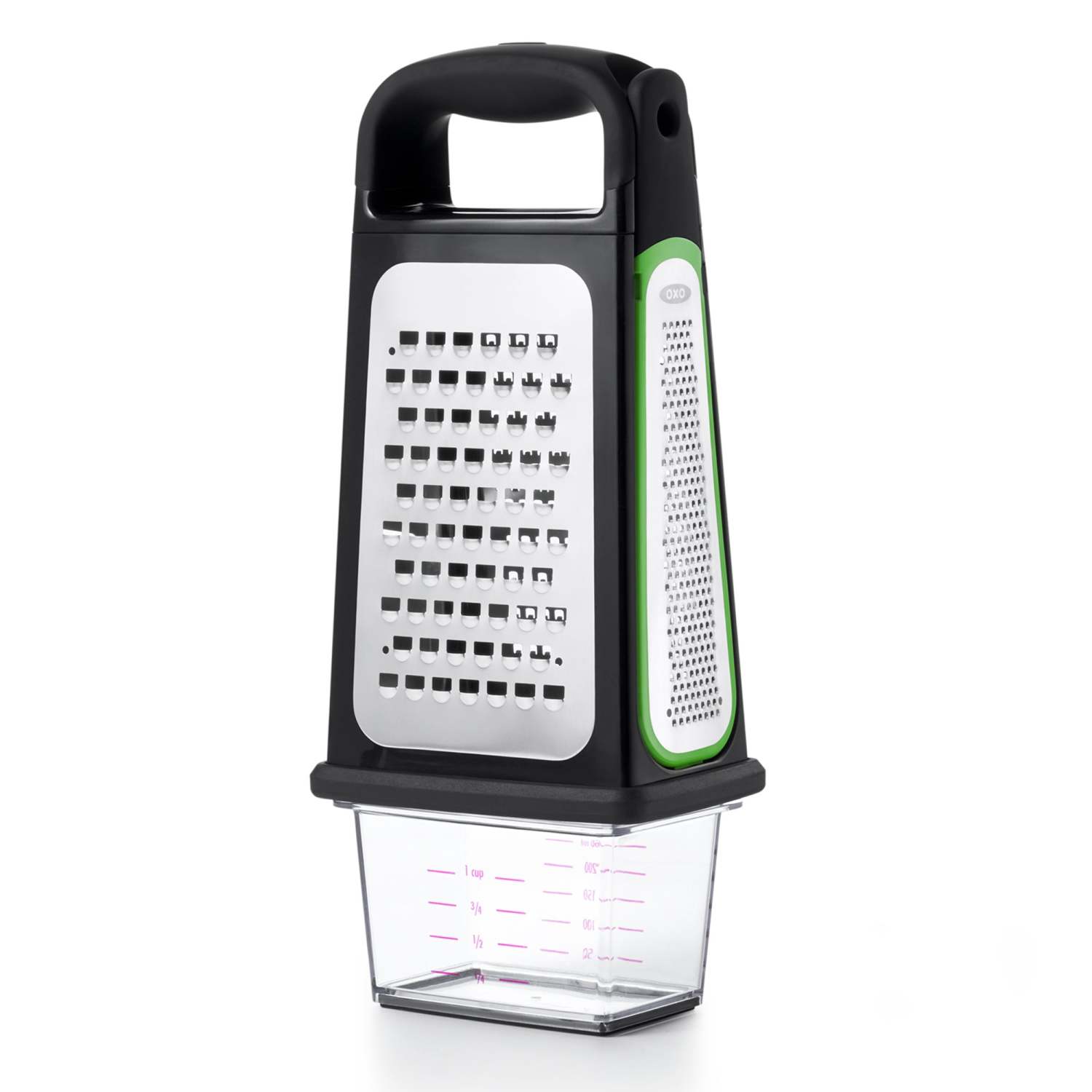 Grate slice shred and zest all in one kitchen tool. Features four stainless steel grating surfaces. Non-slip base keeps grater in place while you work. Soft handle provides a comfortable grip. Includes container t6o catch and measure grated food. Comes with lid to seal container for storage. Top rack dishwasher safe.