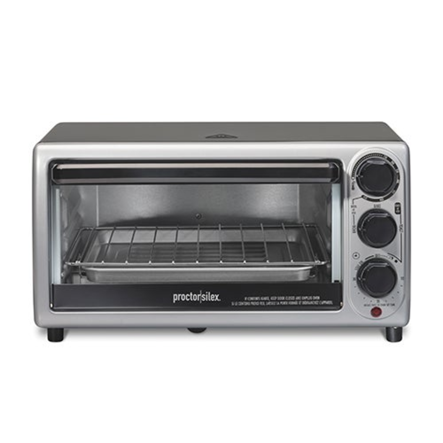 Save time and space in the kitchen with this versatile toaster oven. 3-in-1 versatility - toast broil and bake with Stay on function. Conveniently toast up to 4 slices of bread at a time. Easy to use manual controls - timer knob function and temperature. Ready bell with timer. Built-in crumb tray helps with cleaning. Includes Bake pan and Oven rack. Dimensions: 11.1"D x 13.9"W x 7.6"H.