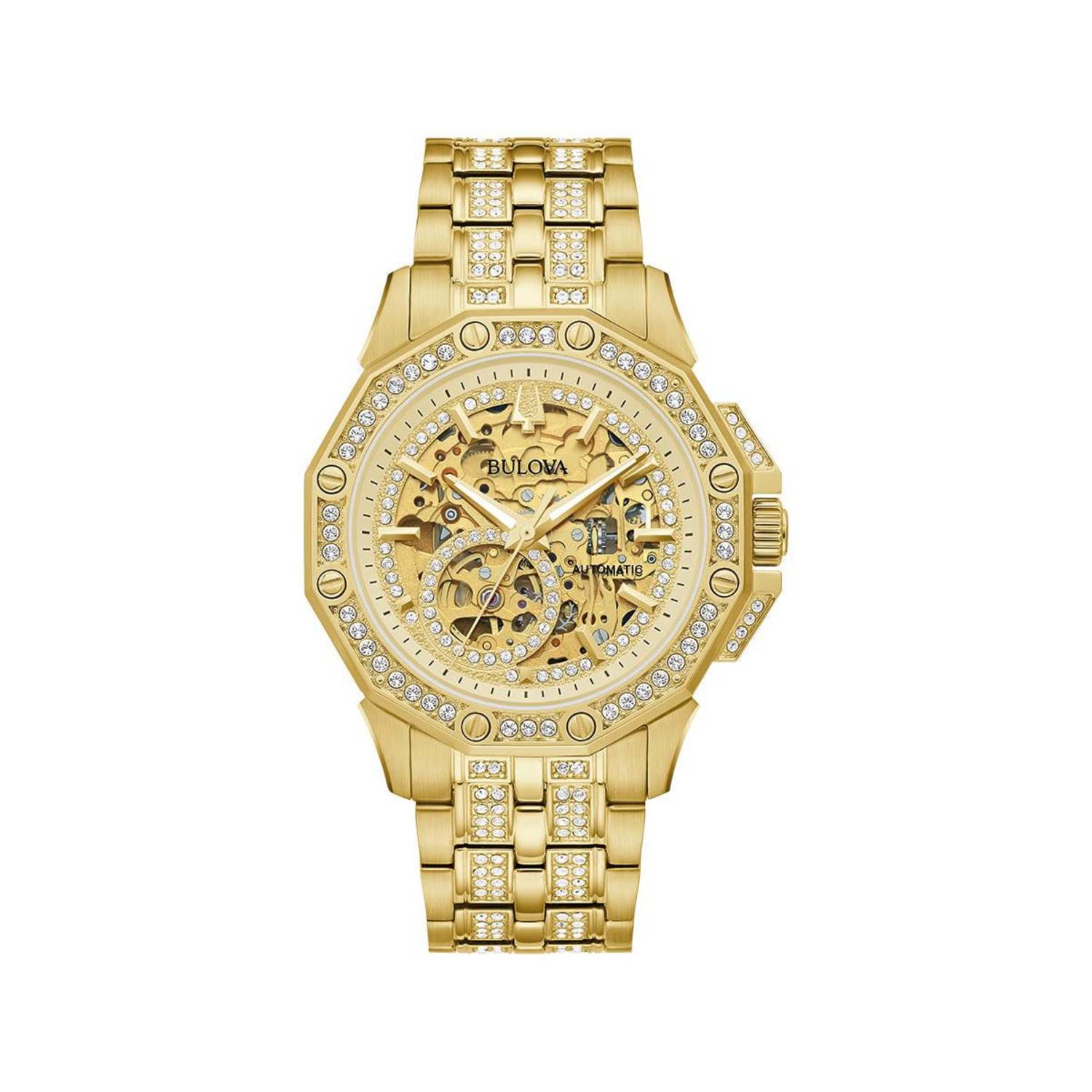 Octava is part of the Crystal Collection at Bulova. Gold-tone stainless steel bezel bracelet and dial are embellished with 251 crystals. Gold-tone skeleton dial with luminous hands. Open aperture 21 Jewel Automatic self-winding movement - never requires a battery. Double-press deployant buckle closure. Mineral crystal dial window. Water resistant up to 30 M. Case width: 41.7mm. Band width: 22mm. 3-Year limited time warranty.