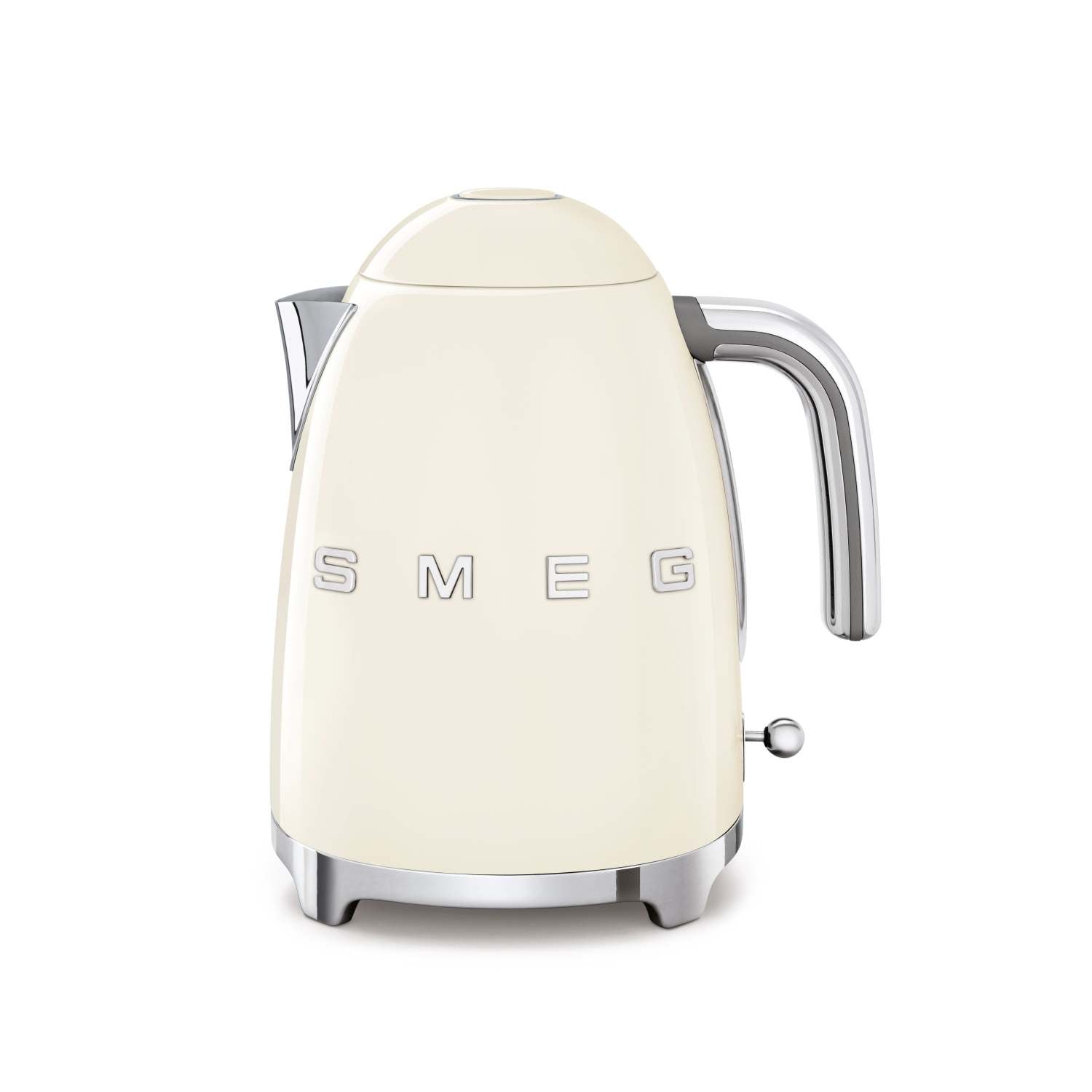 Smeg kitchen appliances offer retro Italian style from its founding in 1948. Press central button for a soft opening. Stainless steel filter built-in filters natural limescale. Super fast boiling supported by 3000W of power. 360-Degree swivel base with non-slip feet. Enameled stainless steel surface ensures excellent heat conduction. Automatic switch off at 212F/100C. Concealed heating element. 1.7-Liter capacity. Built-in cord wrap. Stainless steel body lid and spout. Power: 120V 50/60Hz. Dimensions: 8.875"W x 9.75"H x 6.75"D.