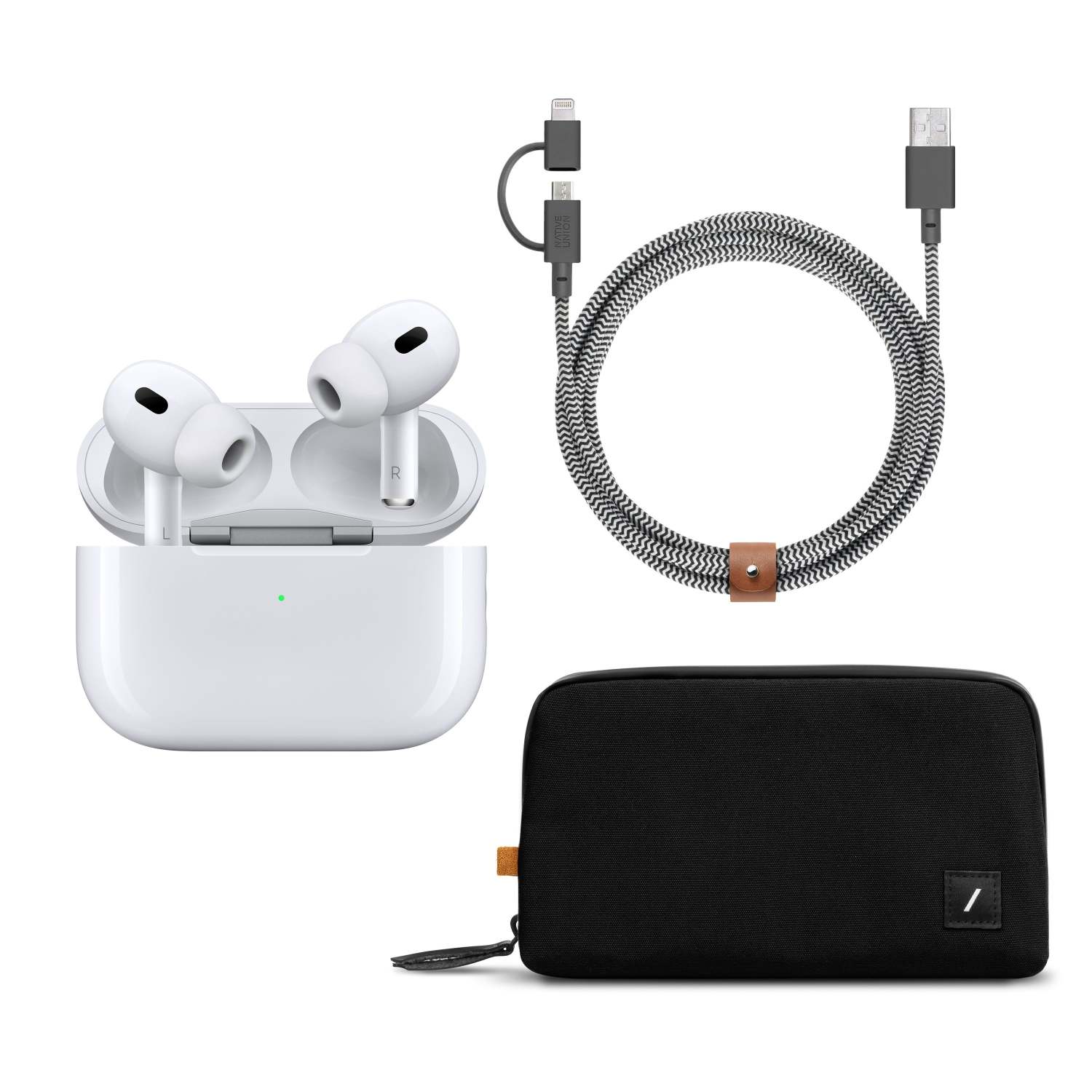 AirPods Pro (2nd Generation) w/ MagSafe Case. Adaptive Audio - blends ANC and Transparency mode. Personalized volume. Conversation Awareness. Personalized Spatial Audio. Charge with MagSafe chargers USB-C connector or Apple Watch charger. 4 Silicone ear tip sizes. Belt Cable Universal 6.5ft 3-in-1 Charging Cable Zebra. Features Micro USB Apple Lightning and USB-C connectors. Work From Anywhere Tech Organizer. Dimensions: 4.53"H x 7.48"W x 2.56"D.