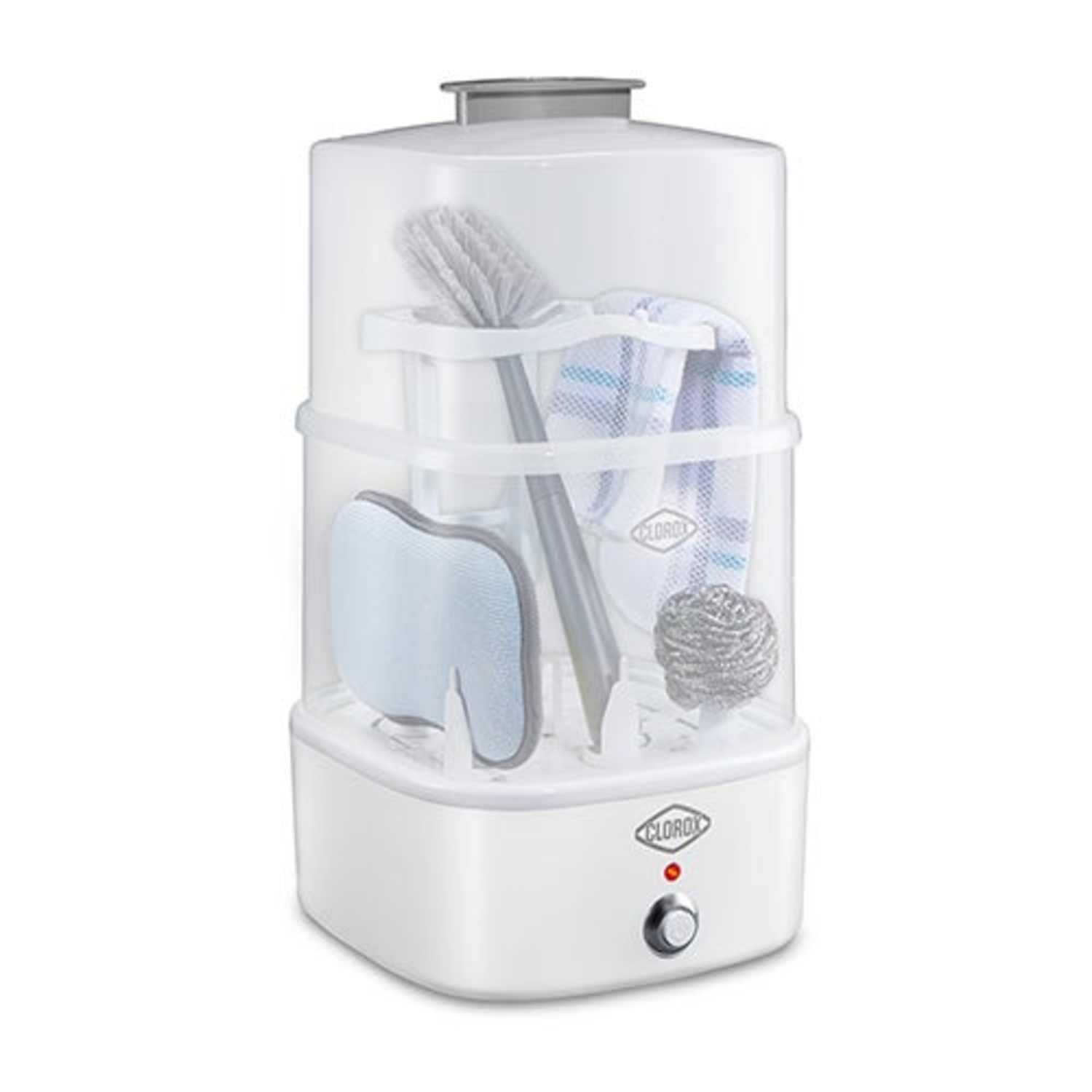 Keep your kitchen utensils &cleaning tools sanitized and ready to use. Powerful sanitizing steam kills 99.9% of bacteria in minutes. Great for sponges dish cloths brushes reusable water bottles & kitchen utensils. Reaches deep into fabrics cracks & crevices for thorough sanitization. Only needs 40-100ml of water. Faster & uses less water than a dishwasher. Adjustable 2-tier capacity. Expands up to 16". Easy to use - fill water reservoir load items & press start. Space-saving storage. Dimensions: 9.2"L x 8.6"W x 10.4"H. Expanded: 9.2"L x 8.6"W x 15.9"H.