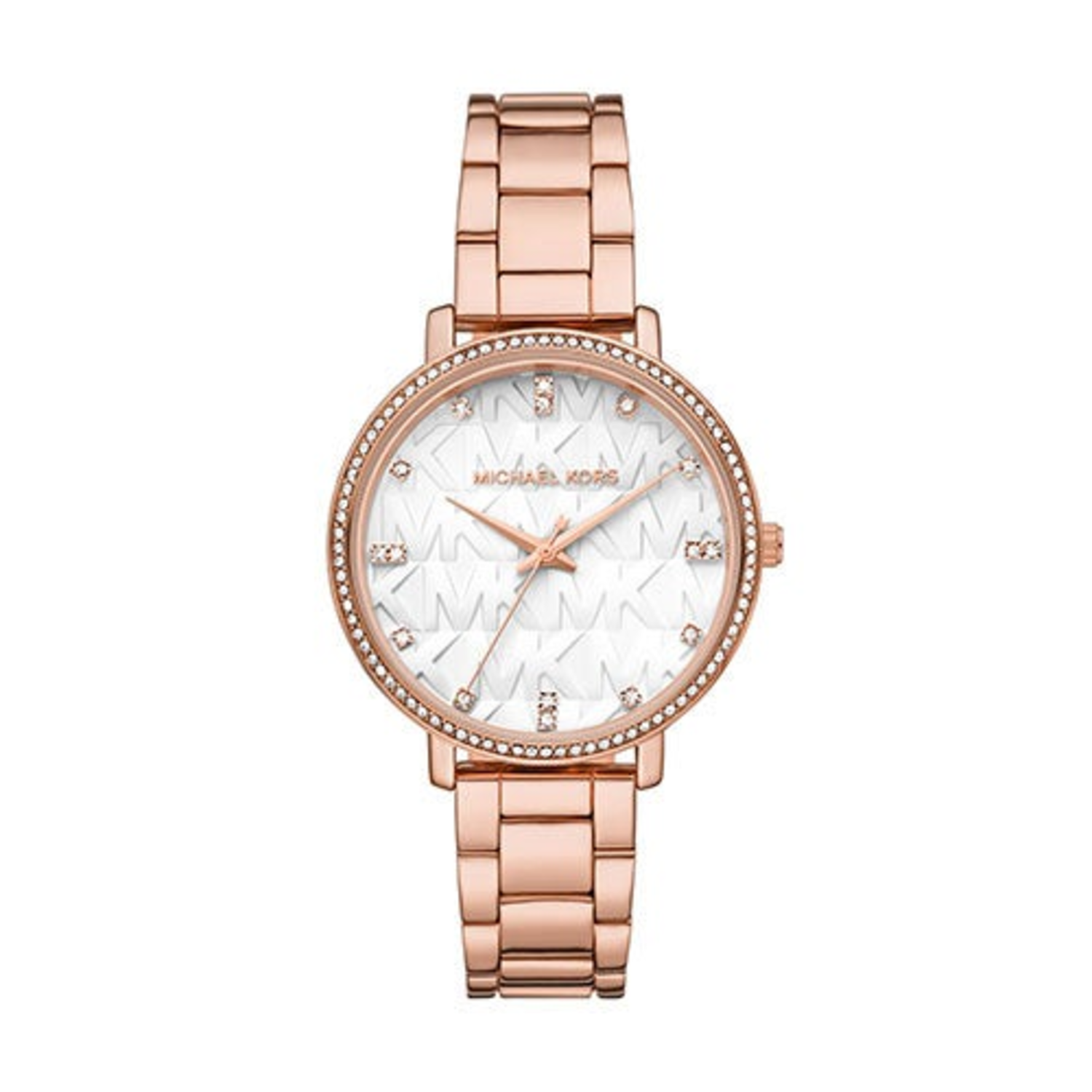 Pyper watches are the definition of everyday elegance. Rose gold-tone stainless steel bracelet case and bezel. White MK stamped dial with crystal hour markers. Three rose gold-tone hands. Bezel fully paved with sparkling crystals. Double push button fold over closure. Bracelet width: 16mm. Case size: 38mm. Water resistant to 30 M.