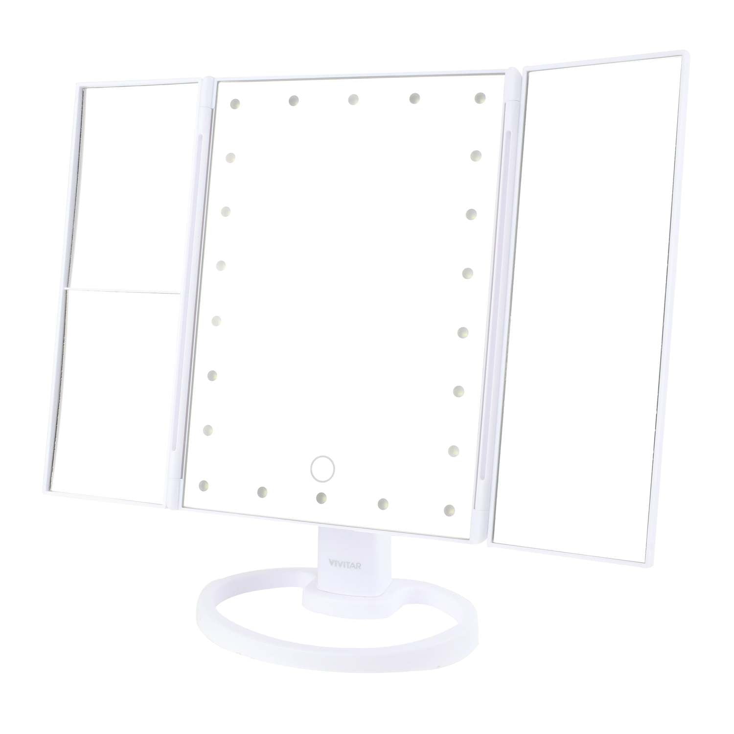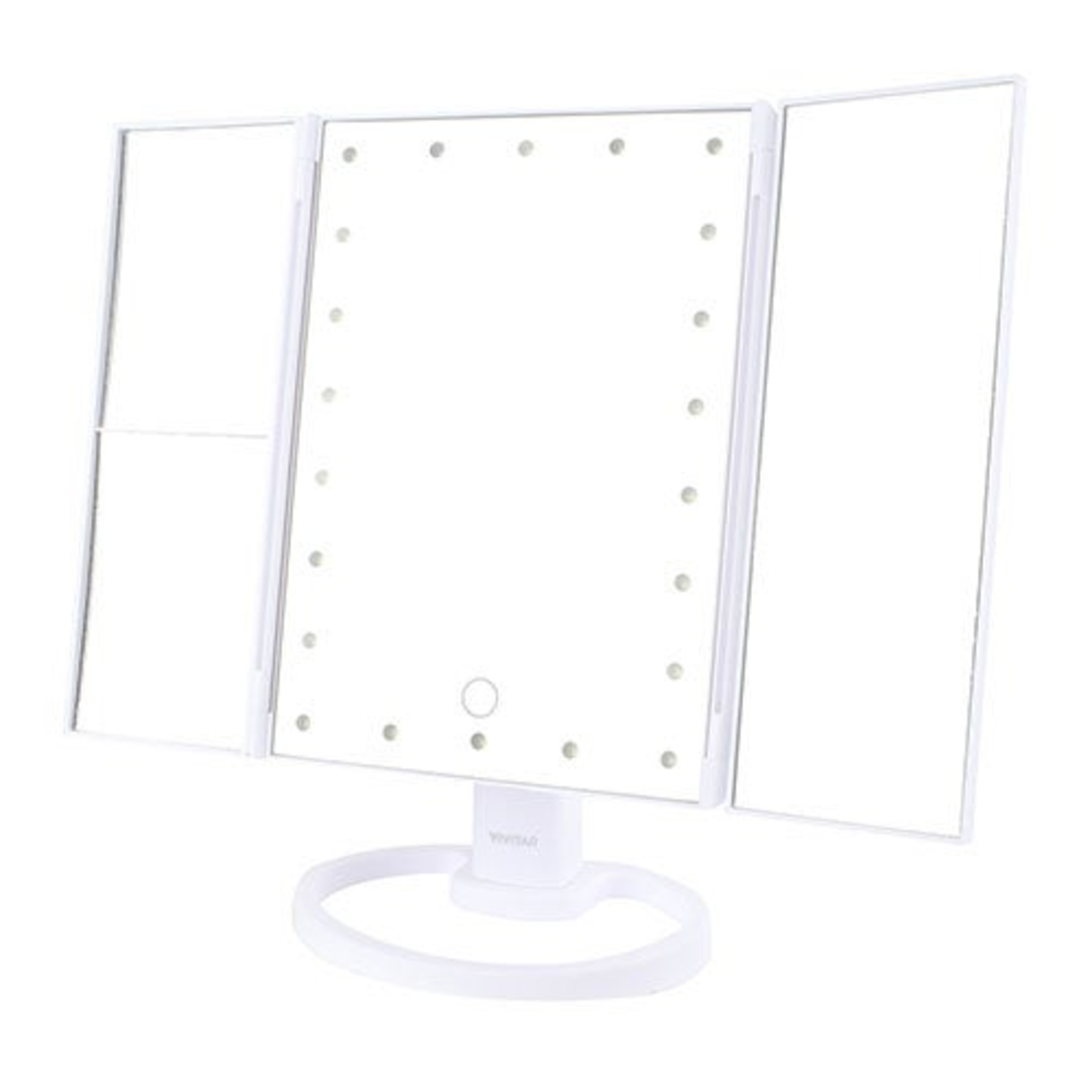 Get ready for your close-up with this LED lighted vanity mirror. Tri-fold design with 1x 2x and 3x magnification. 360-Degree swivel rotation. Touch controls. Glare-free and fog resistant mirrors. Built-in tray at the base to store makeup items or brushes. Rechargeable and cordless design. 24 LED lights around the mirror. Easily put on your makeup and groom with the illuminated light.