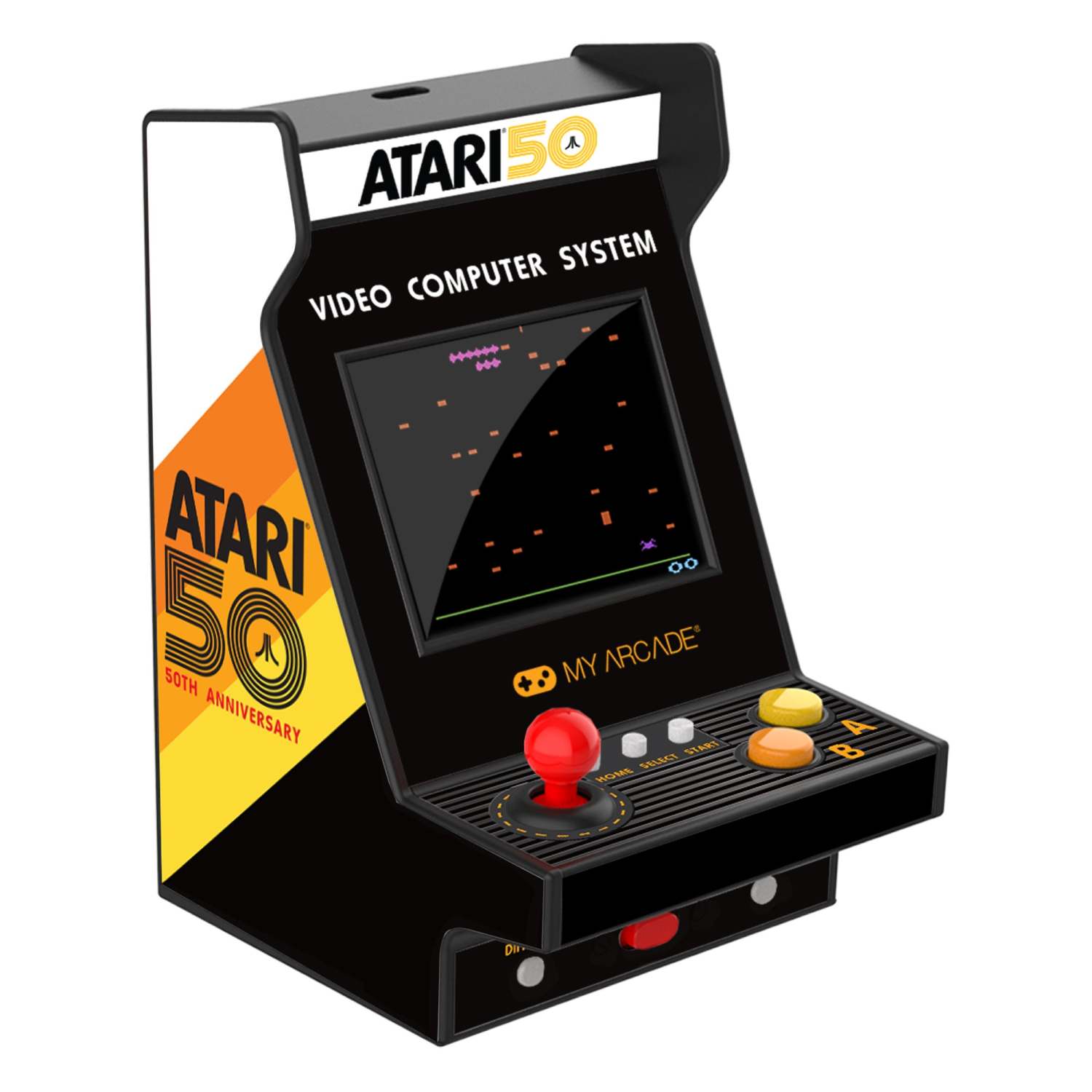 Enjoy the games that pioneered the video game industry with Atari. Officially licensed fully playable Atari titles + bonus games. 75 Video games built-in. Features Asteroids Centipede PONG Breakout Warlords and more. 2.4" Full color screen. Adjustable screen brightness. Built-in rear facing speaker with volume control. Styled like the classic arcade box. Dimensions: 2.94" x 3.38" x 4.75".