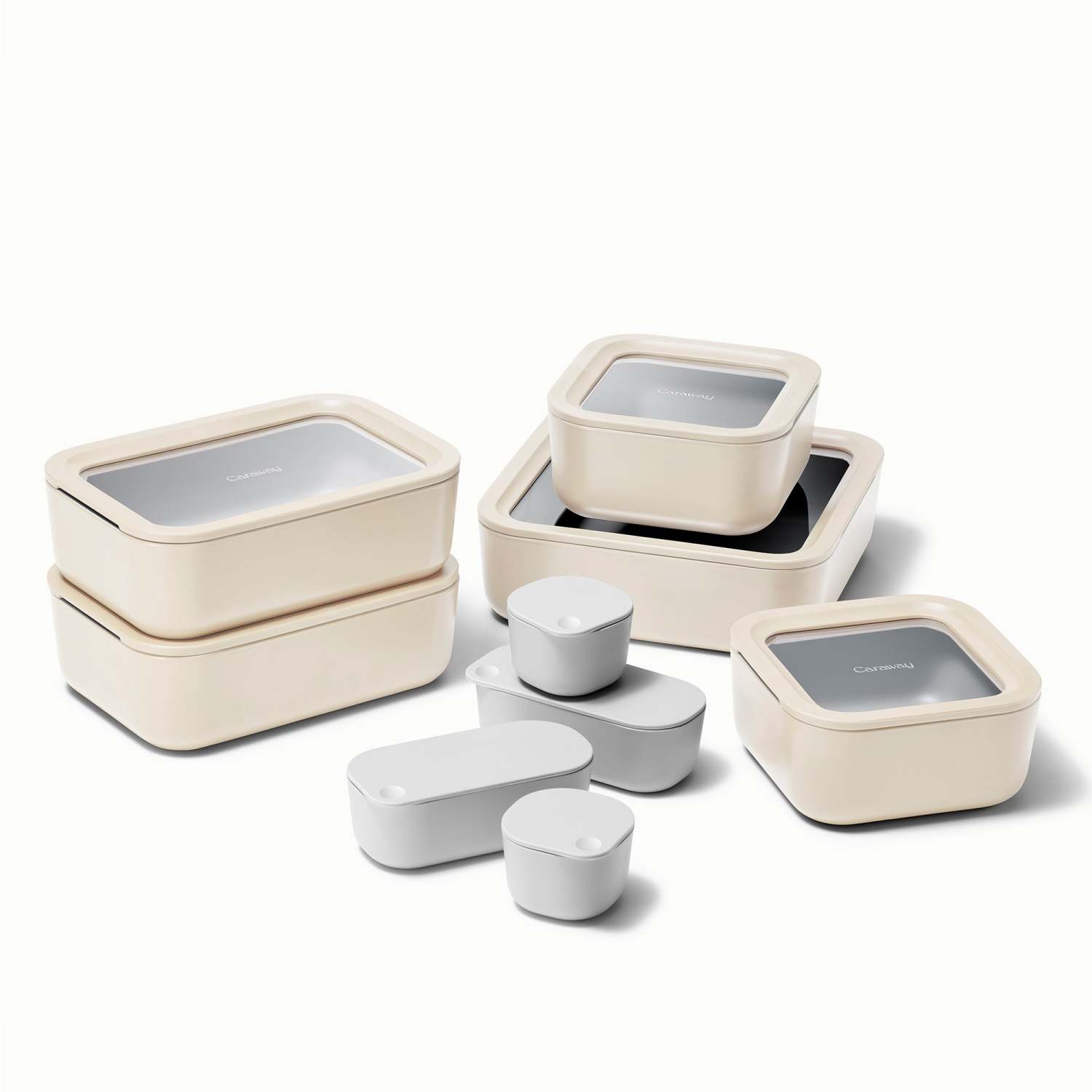 Store your leftovers in the cleanest and best-looking storage set. Dash & Dot inserts are pack sides and sauces. Tight sealed glass lids with an Air Release tech keep food fresh. Non-toxic ceramic coated nonstick. Free of PTFE PFOA PFAS heavy materials BPA and BPS. Microwave oven refrigerator freezer and dishwasher safe. Includes: 10 Cup Large container with lid. (2) 6.6 Cup Medium containers with lid. (2) 4.4 Cup Small container with lids. (2) 4oz Dot inserts. (2) 9oz Dash inserts. (3) Storage caddies. (2) Container straps.