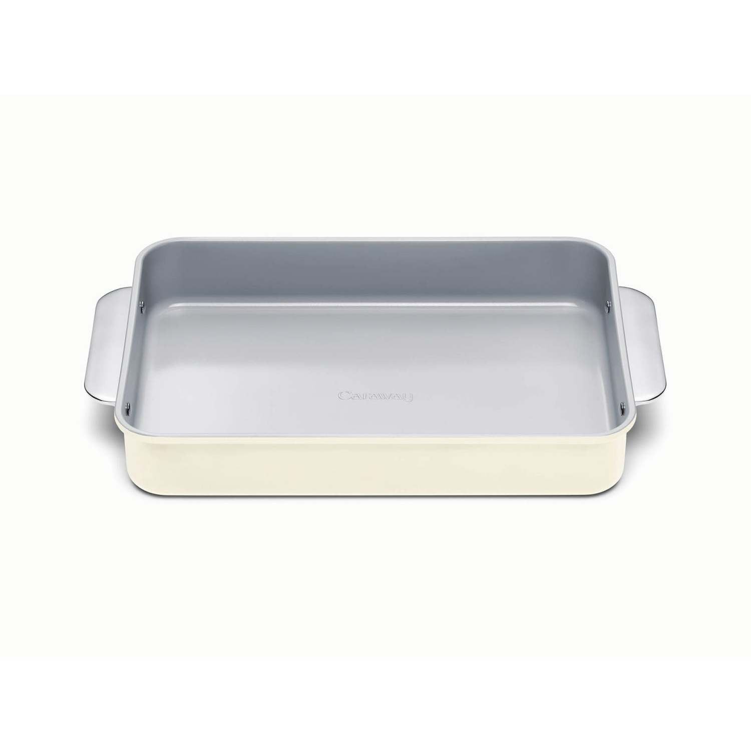 Ready Set Bake - Caraway has made it easier and safer for you. The rectangle pan is perfect for brownies casseroles and more. Super slick nonstick requires less oil or butter for cooking. Nonstick supports minimal scrubbing for a spotless clean. Coating is free of PTFE PFOA PFAS heavy metals and hard anodization. Surface heats consistently without any hot spots. Details and color spark joy in your kitchen and complement any home. Steel body and handles. Oven safe up to 550F. Recommend hand wash. Dimensions: 9" x 13".