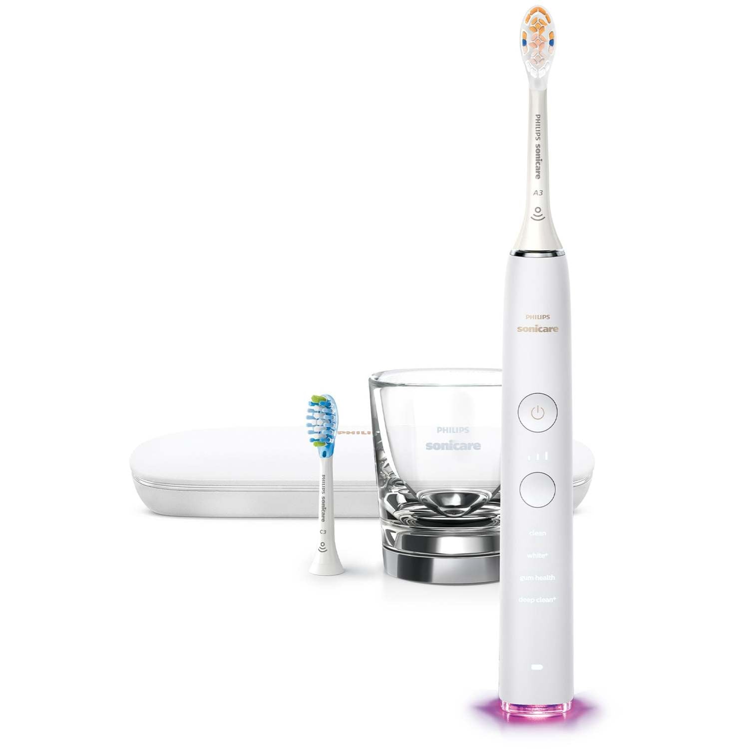 DiamondClean Smart uses smart sensor technology to get brushing feedback. Features location scrubbing and pressure sensors. 3D Mouth map and TouchUp. Knows optimal mode and intensity setting for each brush head. Features four brushing modes and three intensities. Sleek glass holder instantly charges your toothbrush. Three premium brush heads. Removes up to 10x more plaque and 100% stain removal. Pressure feedback with light-up ring or vibrating handle. 2-Year manufacturer limited warranty. Compatible with Android and iOS phones or tablets.