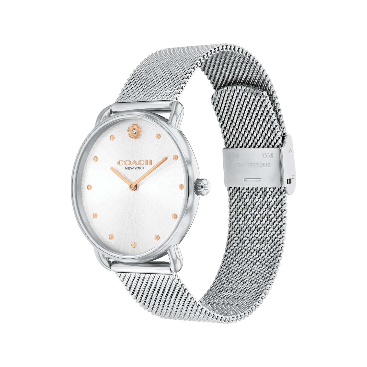 Elliot is a true design classic for workdays and weekends. Characterized with clean lines and a modern minimalist sensibility. Sleek silver-tone stainless steel mesh bracelet. Silver sunray dial with rose gold-tone hour markers and two hands. Dial features rose gold-tone Tea Rose motif at the 12 position. Silver-tone stainless steel bezel and case. Quartz movement. Sliding buckle closure. Case size: 36mm. Water resistant to 30 M.