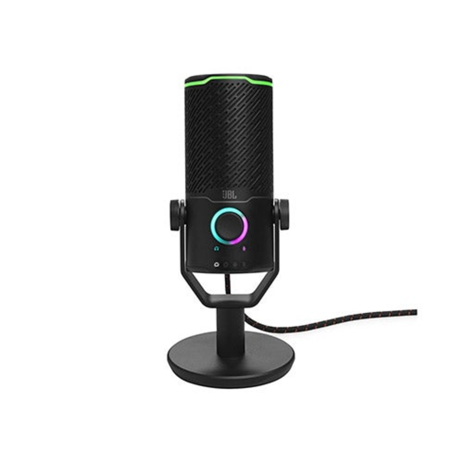 Features three lightweight fast moving 14mm condenser mics. At 192kHz/24 bits recording stream and record with studio-quality. Single button changes between four voice-pick up patterns. Dynamic range compressor keeps voice from clipping or gives boost. Touch sensor on top of the mic turns on mute. RGB VU meter for volume. 3.5mm Connection to monitor voice volume. Universal mounting solution for other systems. Compatible with JBL QuantumENGINE software. Sample rates: 44.1kHz 48kHz 96kHz 192kHz. Includes stand and power cable.