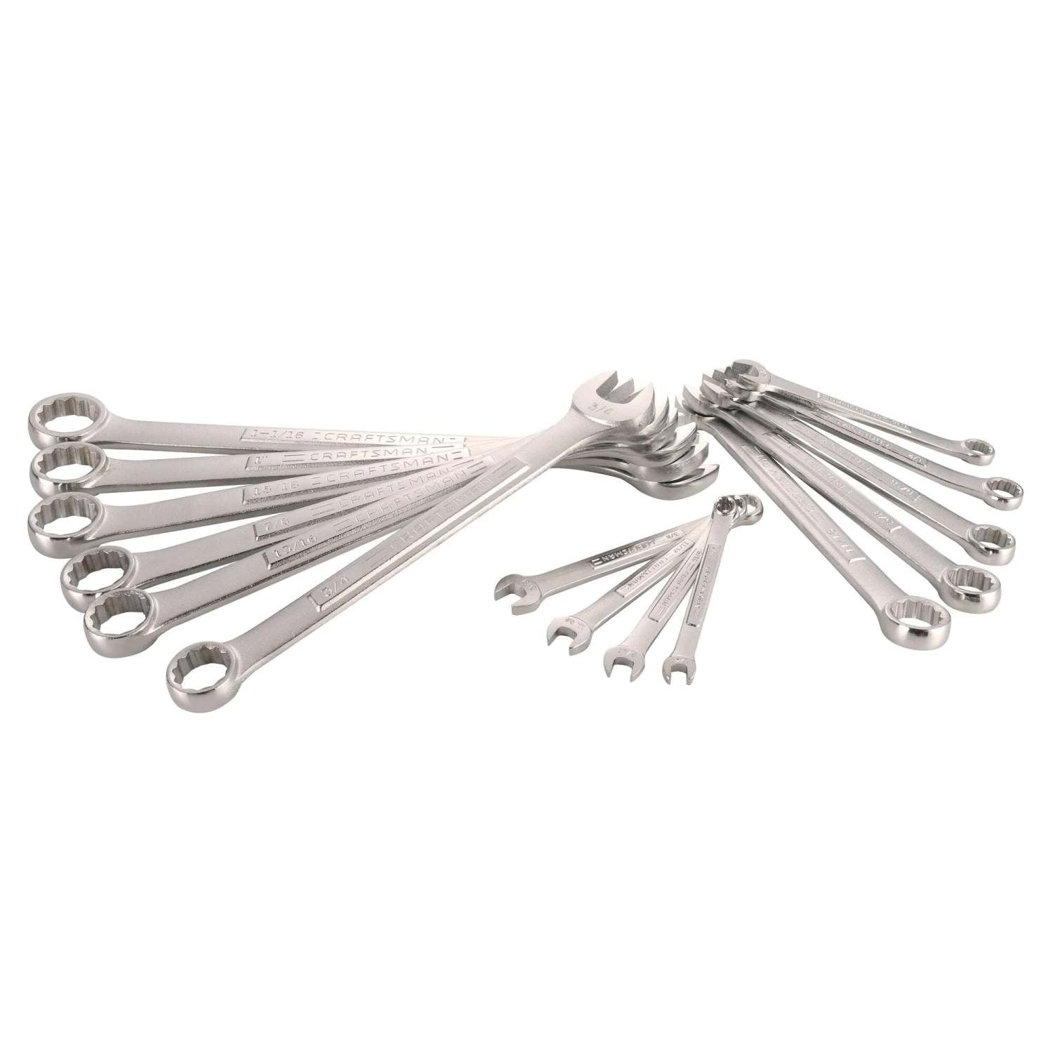 This wrench set offers various sizes to work on specific automotive repairs. Full polish chrome finish is corrosion resistant. 12 Point Box End with fastener supports quick engagement. 15-Degree Box End offset for additional knuckle clearance. Large markings support quick identification. Meets or Exceeds ASME specifications. Includes 1/4" 5/16" 11/32" 3/8" 7/16" 1/2" 9/16" 5/8" 11/16" 3/4" 13/16" 7/8" 15/16" 1" 1-1/16".