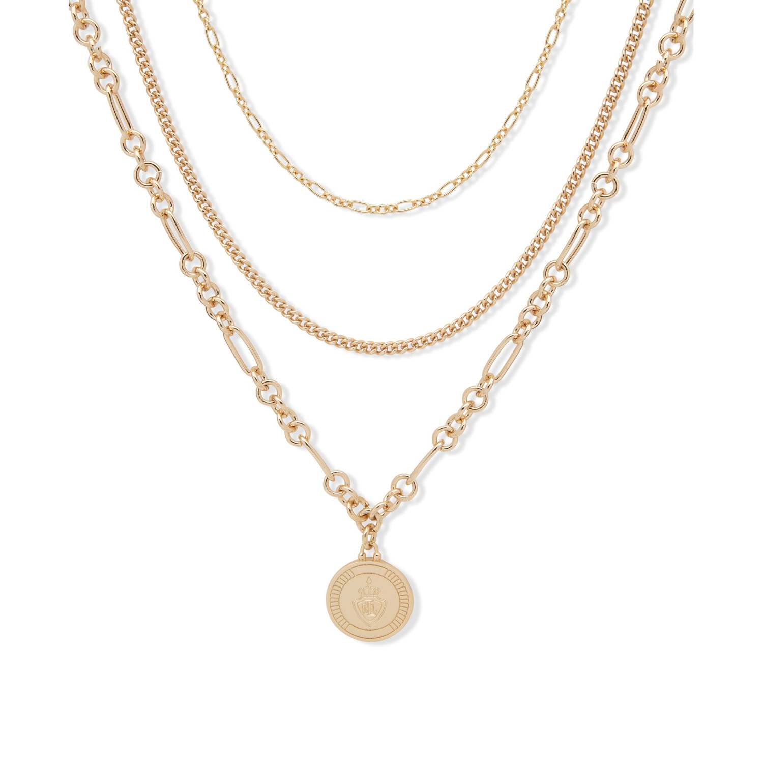 The Multi-Row Pendant offers a layered look in one. Three gold-tone chains made of brass and steel. Features a hanging pendant with Lauren's signature crest. Secure lobster clasp closure. Measures 16" long with 3" extender.