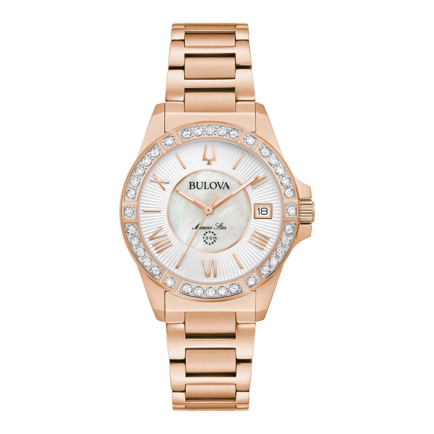 This Marine Star watch adds a touch of timeless glamour to your look. Rose-gold tone stainless steel H-link bracelet bezel and case. White Mother-of-Pearl dial with rose gold Roman numerals and stick indices. Day of the month window at the 3 position. Bezel is fully paved with 24 individually handset diamonds. Luminous minute and hour hands with rose gold-tone seconds hand. Sapphire crystal dial window is scratch resistant. Double push button deployant closure. Lug width: 16mm. Case size: 32mm. Water resistant to 100 M.