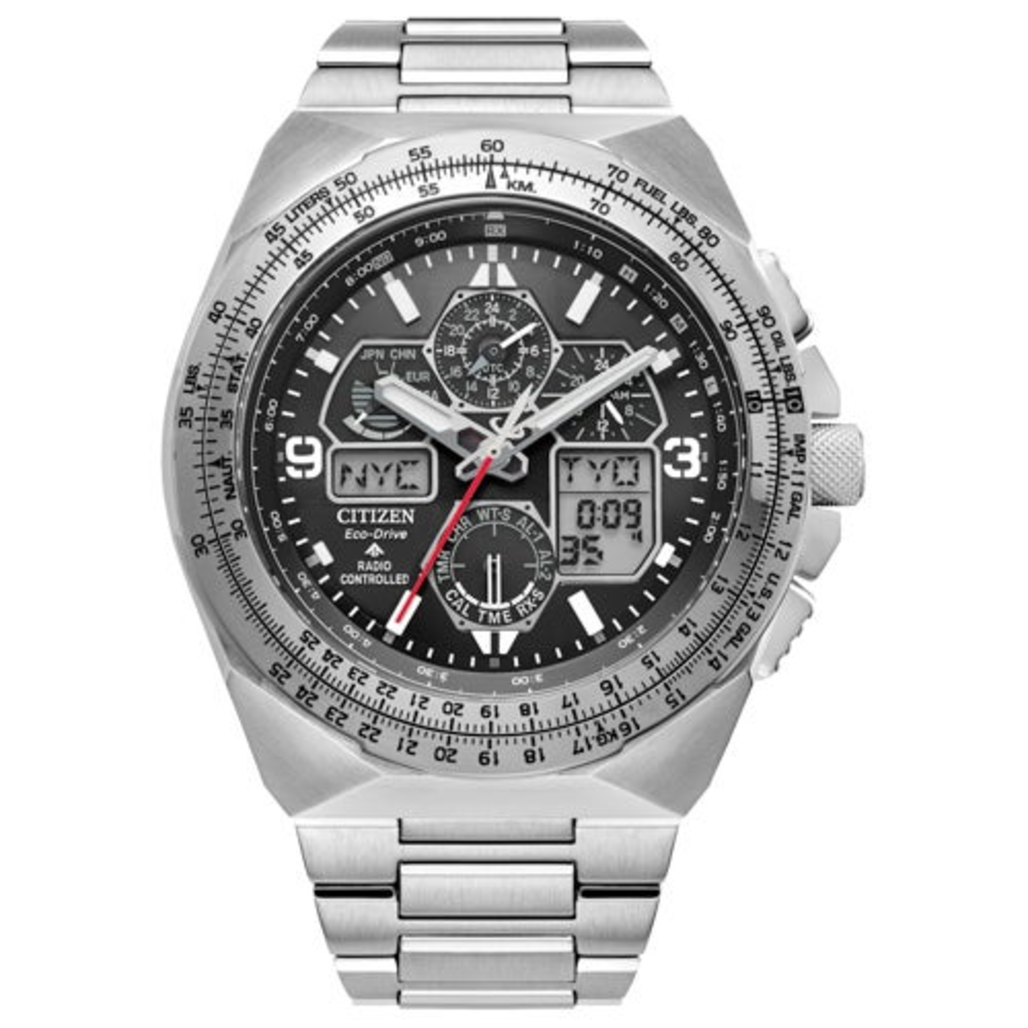 Promaster Skyhawk A-T reaches higher with an ultramodern look. Eco-Drive technology. Atomic Timekeeping in 43 World Cities. 1/100-Second chronograph measures up to 24 hours. Perpetual calendar dual time alarms and countdown timer. Digital backlight and UTC display. Power reserve. Pilot's slide rule bezel. Silver-tone stainless steel bracelet bezel and case. Black ana/digi chronograph dial. Sapphire crystal window scratch resistant. Double push buttons with fold over closure. Lug width: 22mm. Case size: 46mm. Water resistant to 200 M.