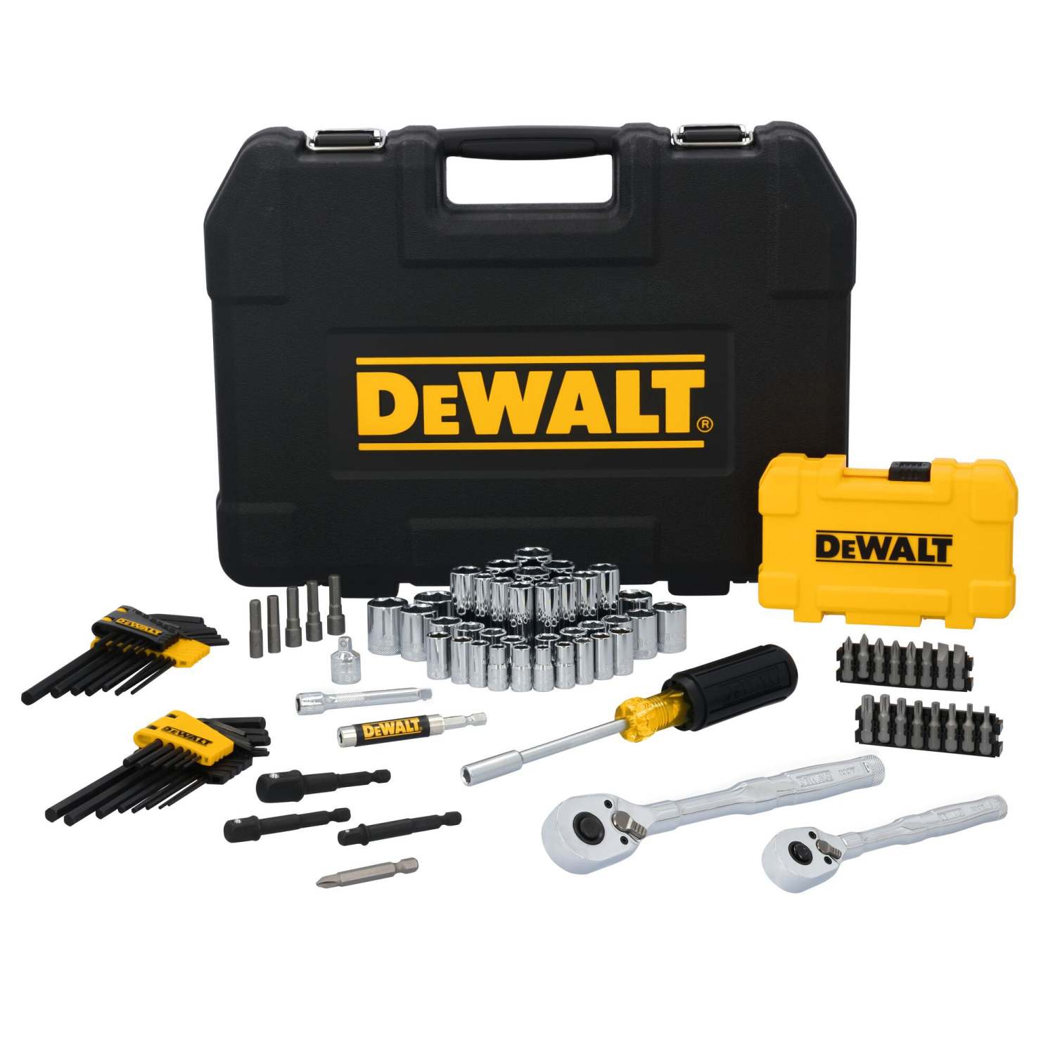 Sockets feature powerjaw technology. 144-Tooth count ratchet with a 2.5-degree arc swing. Full-polish chrome finish with corrosion resistance. Comes in a storage and carry case. Ratchet with quick release for one-handed operation. Size markings on tools. Meets or exceeds ANSI specifications. Lifetime manufacture warranty. Includes: (2) 1/4" & 3/8" 144T Ratchets. (16) 1/4" 6pt Standard & Deep Sockets MM/SAE. (20) 3/8" 6pt Standard & Deep Sockets MM/SAE. Extension Bar. 3/8" to 1/4" Adapter. (28) Hex Keys MM/SAE. (5) Nut Bits. Bit Driver. Accessory Case.