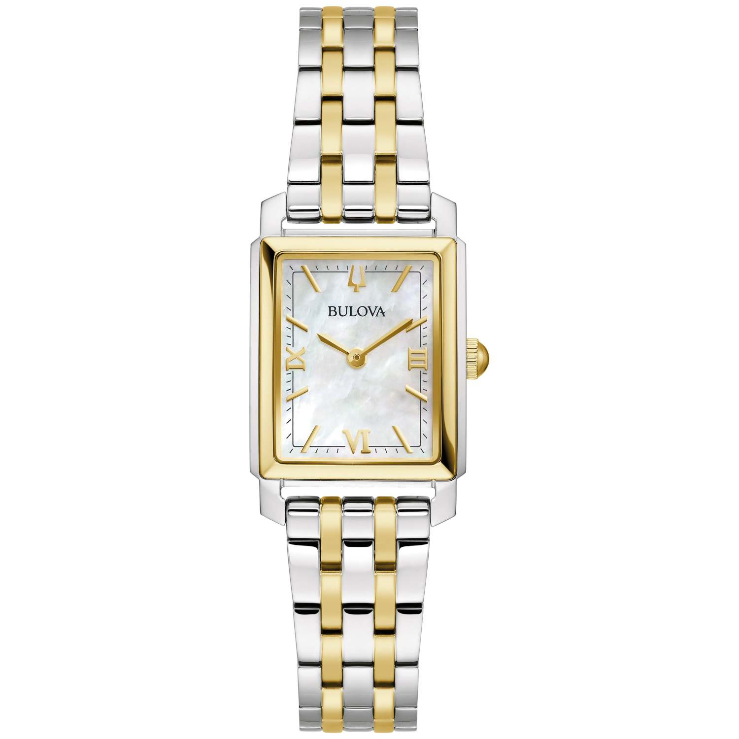 This Sutton watch will be the timepiece you never want to take off. Silver and gold-tone stainless steel bracelet bezel and case. Mother-of-Pearl rectangle dial with gold-tone hour markers Roman numerals and two hands. Signature gold-tone Bulova tuning fork logo at the 12 position. Curved mineral crystal window. Double push button deployant closure. Lug width: 14mm. Case size: 21mm x 33mm. Water resistant to 30 M. 3-Year manufacturer limited warranty.
