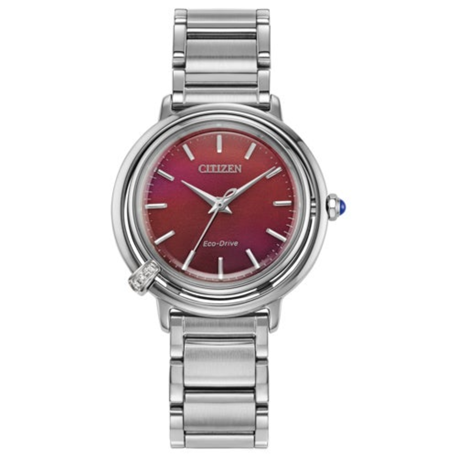 Arcly is an glamorous addition of sustainable luxury. Eco-Drive technology - runs on light never needs a battery replacement. Silver-tone stainless steel bracelet bezel and case. Includes interchangeable deep red apple leather strap with buckle closure. Deep Red dial with silver hour markers and three hands. Bezel features a small diamond accent. Subtle blue top crown. Double push button deployant closure. Spherical sapphire crystal window. Lug width: 14mm. Case size: 31.2mm. Water resistant to 50 M. 5-Year manufacturer limited warranty.