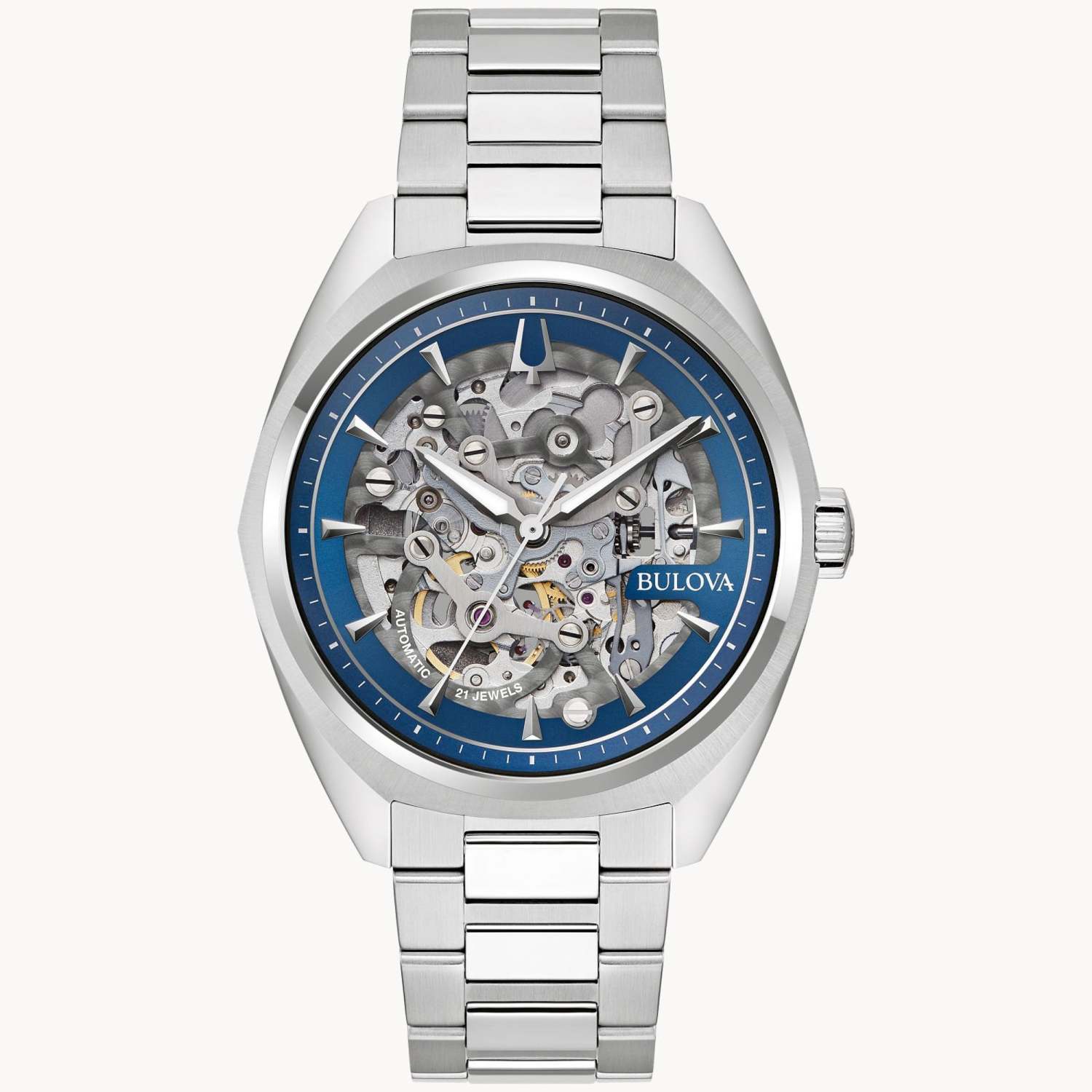 This Surveyor watch offers automatic timekeeping in a skeleton design. Automatic movement - powered by the release a wound spring that winds with the motion of the wearer's arm. Features 21 jewels and a 42 hour power reserve. Silver-tone stainless steel H-link bracelet bezel and case. Silver skeleton dial with blue ring and hour markers. Three silver-tone hands with luminescent fill. Domed mineral crystal window. Push button deployant closure. 20mm Lug width. 41mm Case size. Water resistant to 30 M. 3-Year manufacturer limited warranty.