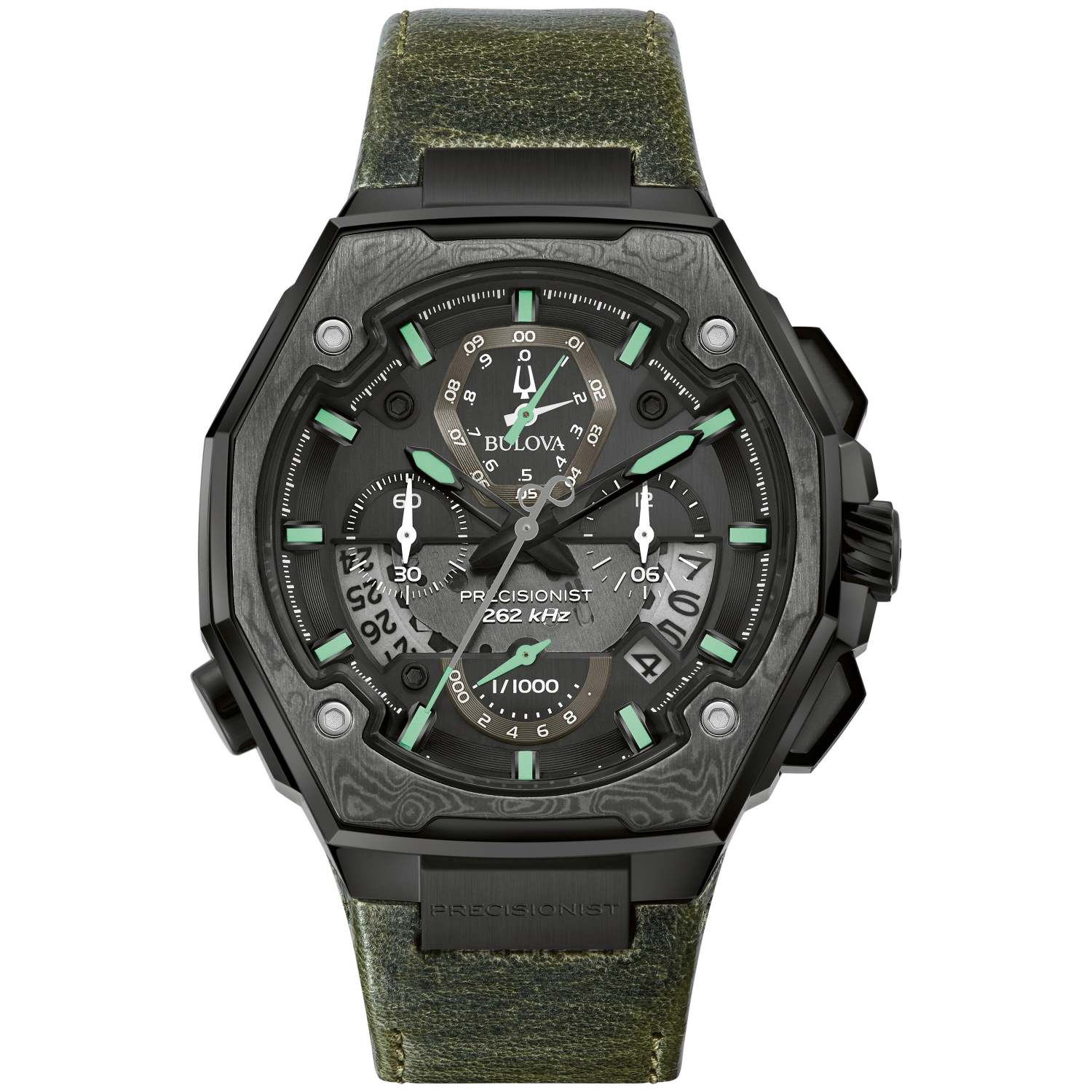 This Series X Special Edition watch marks the 10th anniversary of the Precisionist movement. HPQ Precisionist - 3-pronged quartz crystal with frequency of 262kHz is 8x greater than standard quartz. Green leather strap with push buttons deployant closure. Black chronograph dial with green accents and luminous hands and markers. Four chronograph subdial display. Day of the month calendar. Gray Damascus steel top ring insert. Anti-reflective curved sapphire crystal. Case size: 45mm. Water resistant to 50 M. 3-Year manufacturer limited warranty.
