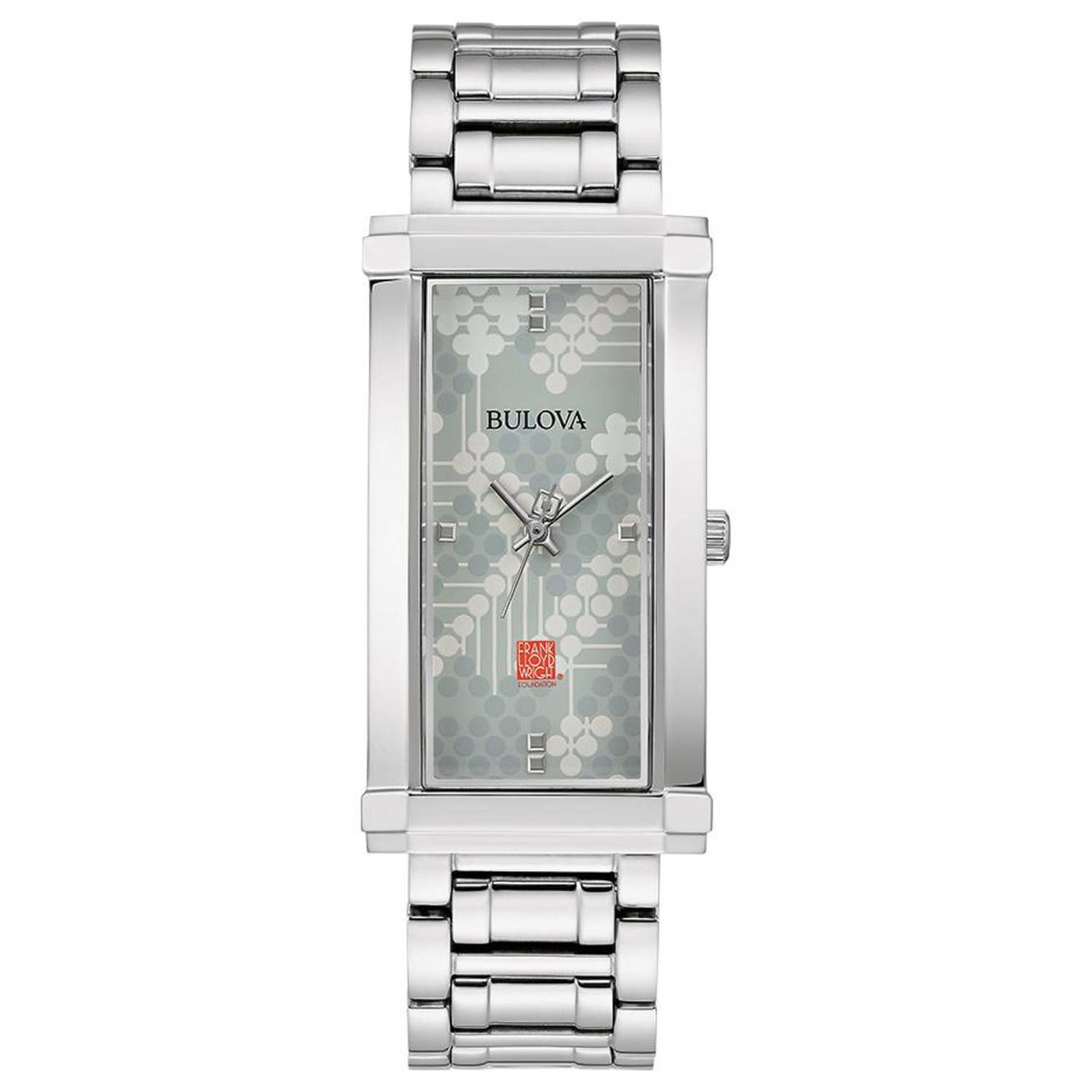 Dial backdrop relates to #106 a fabric pattern developed by Frank Lloyd Wright. Silver-tone stainless steel bracelet bezel and case. Light gray rectangular dial with four raised hour markers and three hands. Metalized curved mineral crystal. Double push button deployant closure. Lug width: 18mm. Case size: 24.6mm. Water resistant to 30 M. 3-Year manufacturer limited warranty.