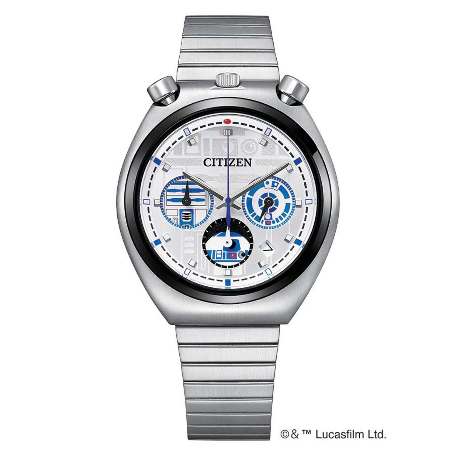 R2-D2 inspired watch from the Star Wars. Silver-tone stainless steel bracelet and case. Case reflects the design of R2-D2. Dial has a raised look echoing his panels with Artoos distinctive blue and red details. Classic Star Wars logo is etched on the case back with an intricate image of the dutiful droid. Miniature R2-D2 detail on the Sub-dial at the 6 o'clock position. Day of the month window between 4 and 5 positions. 1 Second Chronograph. Quartz movement. Sliding safety clasp. Case size: 38mm. Lug width: 18mm. Water resistant: 100 M.