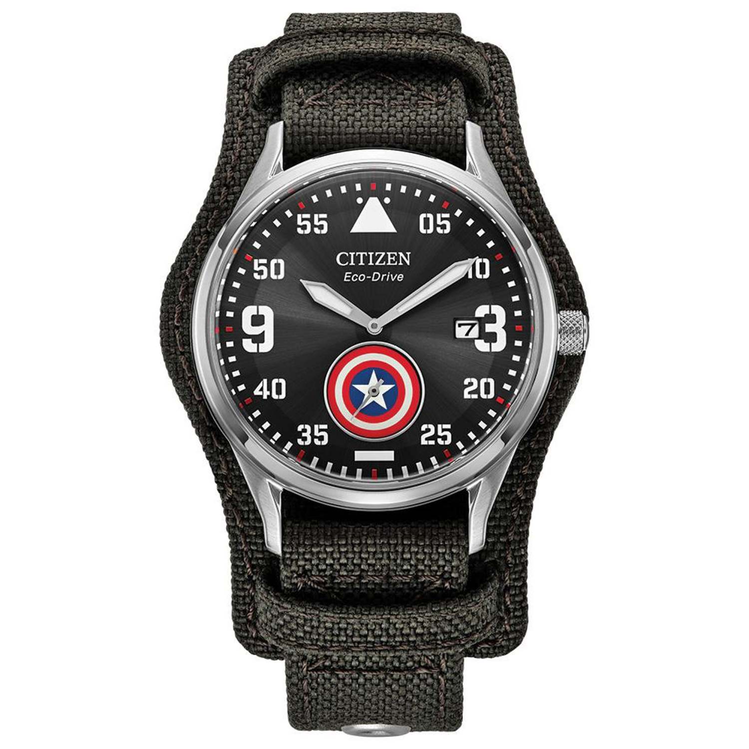 The story of the first Avenger continues to captivate fans worldwide. Eco-Drive technology runs on light never needs a battery replacement. Gray Cordura nylon strap with buckle closure. Black dial with luminous print and hands. Dial features the iconic Vibranium alloy shield of Captain America. Day of the month window at the 3 position. Silver-tone stainless steel bezel and case. Case back showcases the Captain America logo. Spherical mineral crystal window. Lug width: 20mm. Case size: 40mm. Water resistant to 50 M. 5-Year manufacturer limited warranty.