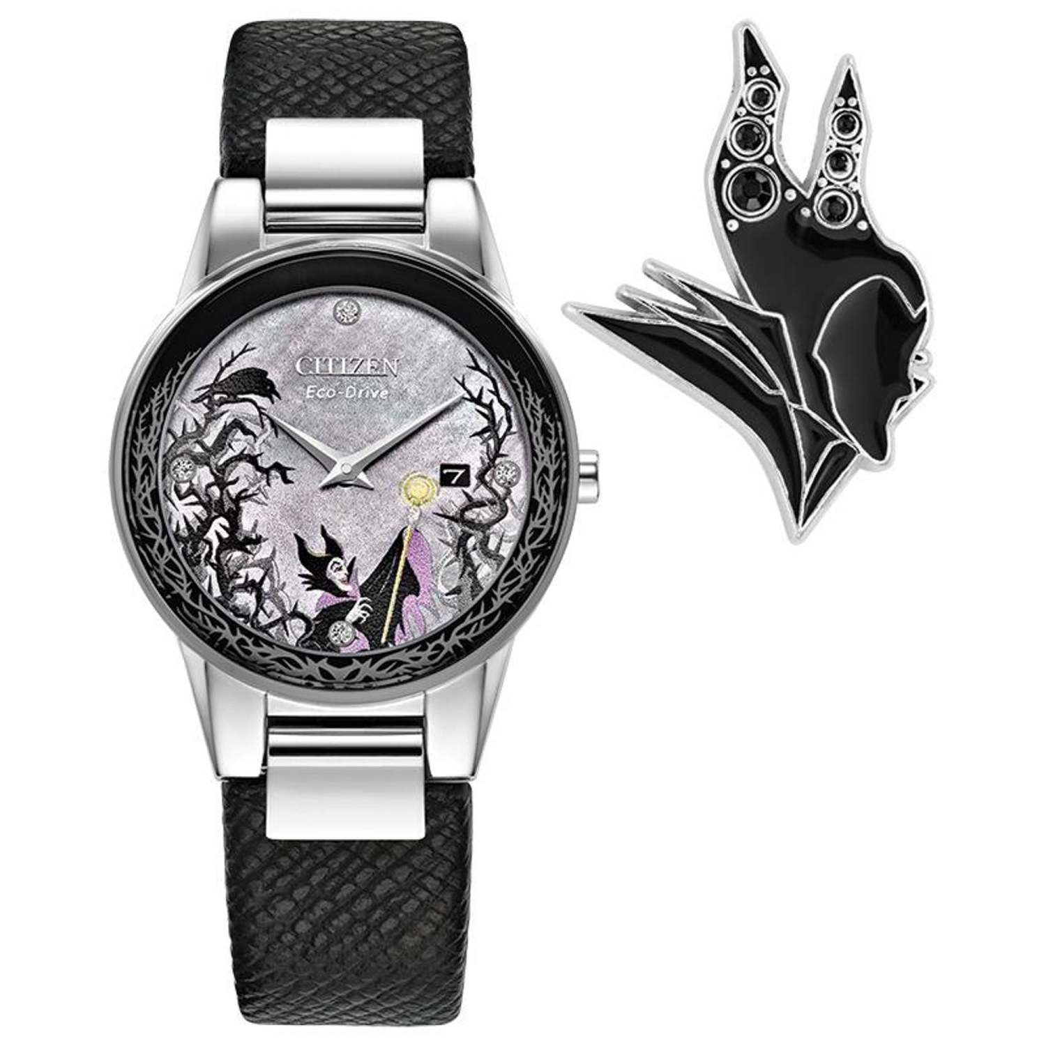 Maleficent's Charm watch comes with a pin showcasing the villain's silhouette. Eco-Drive technology runs on light never needs a battery replacement. Black textured leather strap with traditional buckle closure. Moody gray dial with four crystal hour markers. Bottom of the dial is the Mistress of All Evil herself and her pet raven. Day of the month calendar at the 3 position. Brushed silver-tone stainless steel case. Mineral crystal dial window. Lug width: 10mm. Case size: 29.5mm. Splash resistant. 5-Year manufacturer limited warranty.