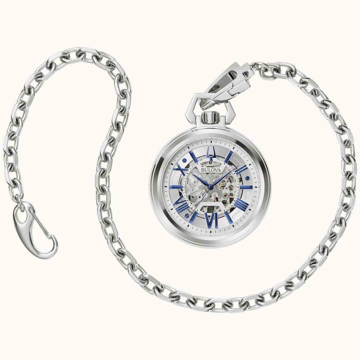 Experience the foundation of American watchmaking with the Sutton pocket watch. Automatic movement with 21 jewels and a power reserve of 42 hours. Silver-tone stainless steel chain case and bezel. Silver-white dial with blue Arabic numerals hour markers and three hands. Central aperture offers a view at the timepiece's inner workings. 15" Chain with tuning fork spring clip for secure attaching. Mineral crystal dial window. Case size: 50mm. Water resistant to 30 M. 3-Year manufacturer limited warranty.